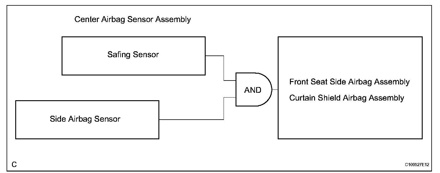 - The center airbag sensor assembly causes the front seat side airbag assembly and the curtain shield airbag assembly to deploy when receiving signals from the side airbag sensor.