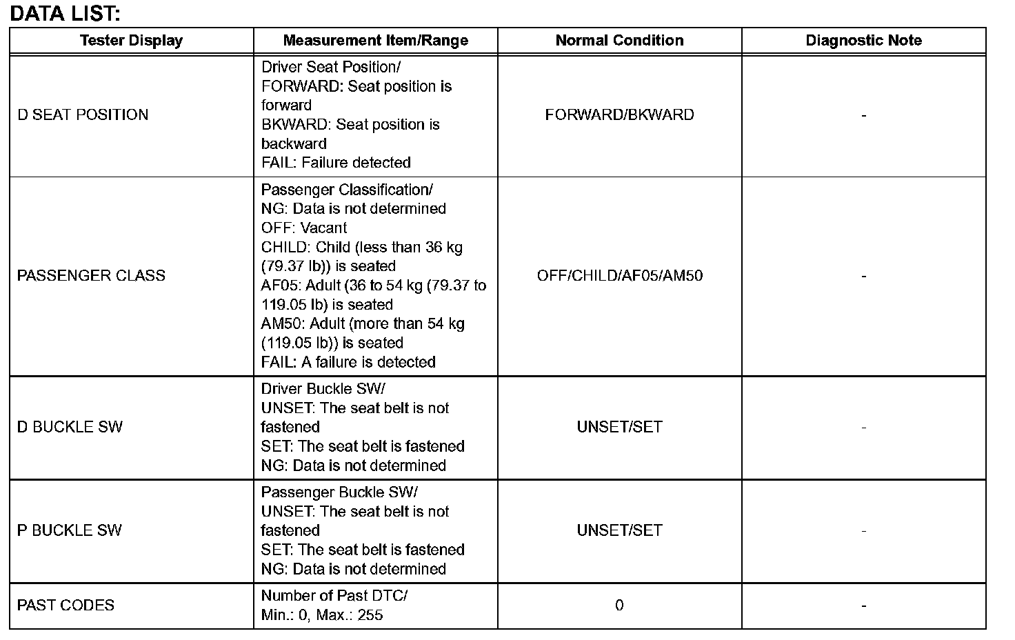 1. DATA LIST FOR CENTER AIRBAG SENSOR ASSEMBLY