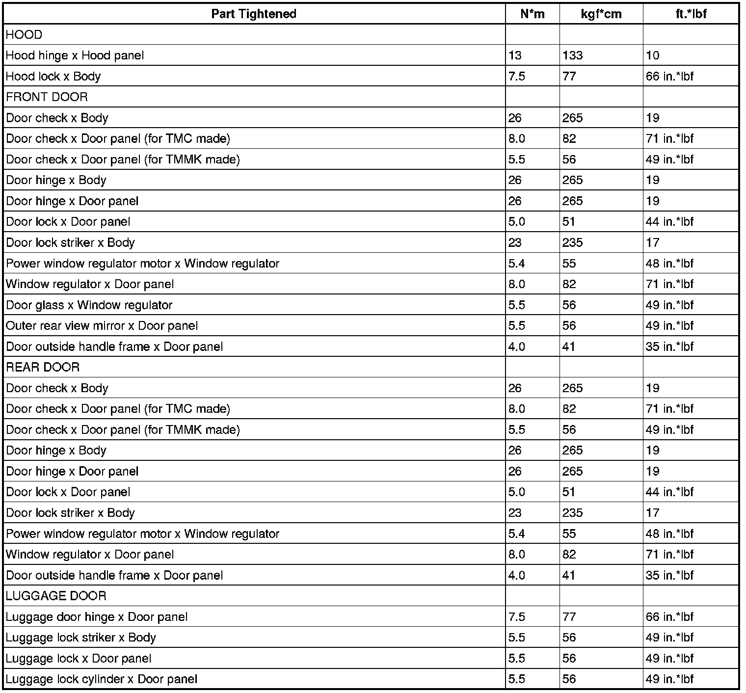 / DOOR: TORQUE SPECIFICATIONS
