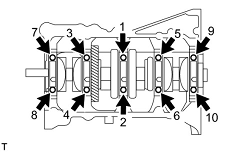 Install and uniformly tighten the 10 main bearing cap bolts in the sequence shown in the illustration.
