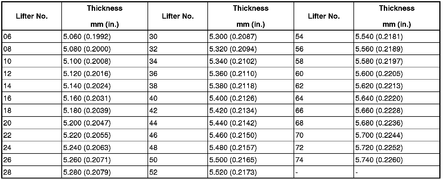 Lifters are available in 35 sizes in increments of 0.020 mm (0.0008 in.), from 5.060 to 5.740 mm (0.1992 to 0.2260 in.).