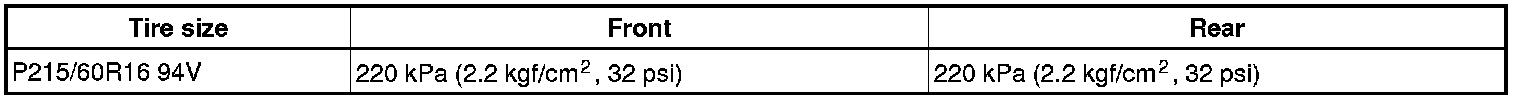 When driving under the above vehicle conditions at sustained high speeds above 160 km/h (100 mph), in countries where such speeds are permitted by law, inflate the front and rear tires to 240 kPa (2.4 kgf*cm2, 35 psi) provided that it does not exceed the maximum cold tire inflation pressure molded on the tire sidewall.