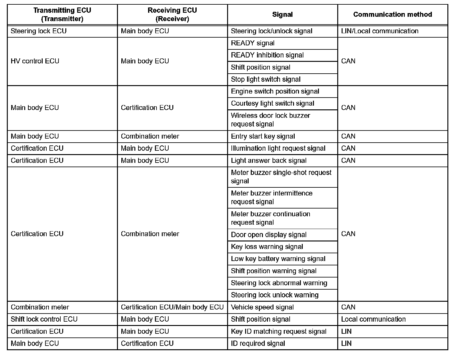 g. The certification ECU judges and verifies the ID code, and transmits a key verification OK signal to the main body ECU. The buzzer in the combination meter sounds at the same time.