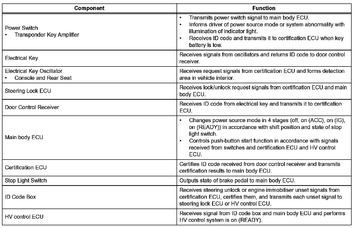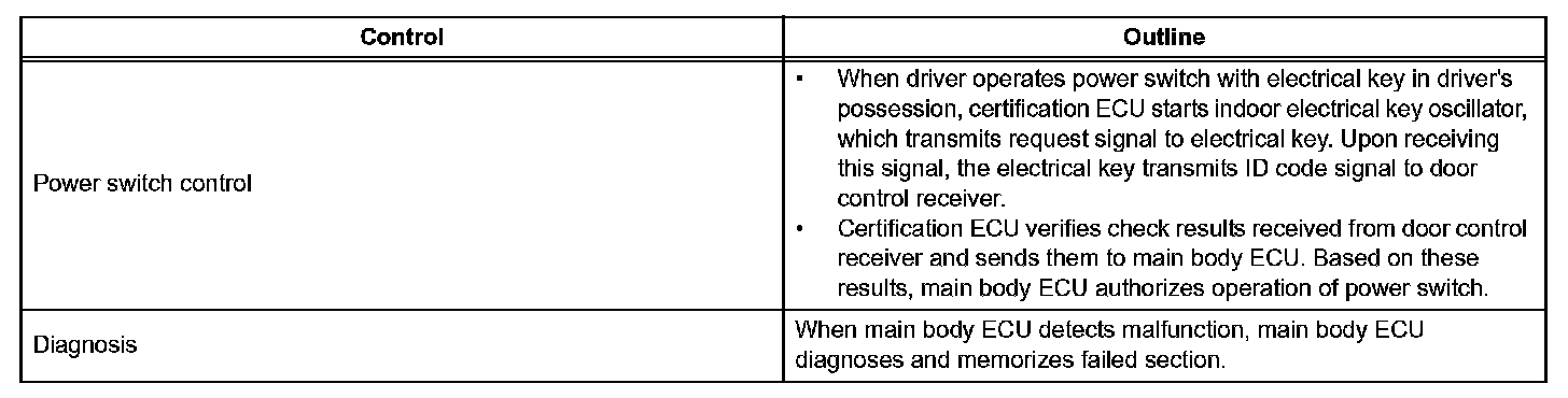 a. The push-button start function uses a push-type power switch, which the driver can operate by merely carrying the electrical key. This system consists primarily of the main body ECU, power switch, ID code box, steering lock ECU, electrical key, ACC relay, IG1 relay, IG2 relay and certification ECU. The main body ECU controls the function. This function operates in cooperation with the smart key system.