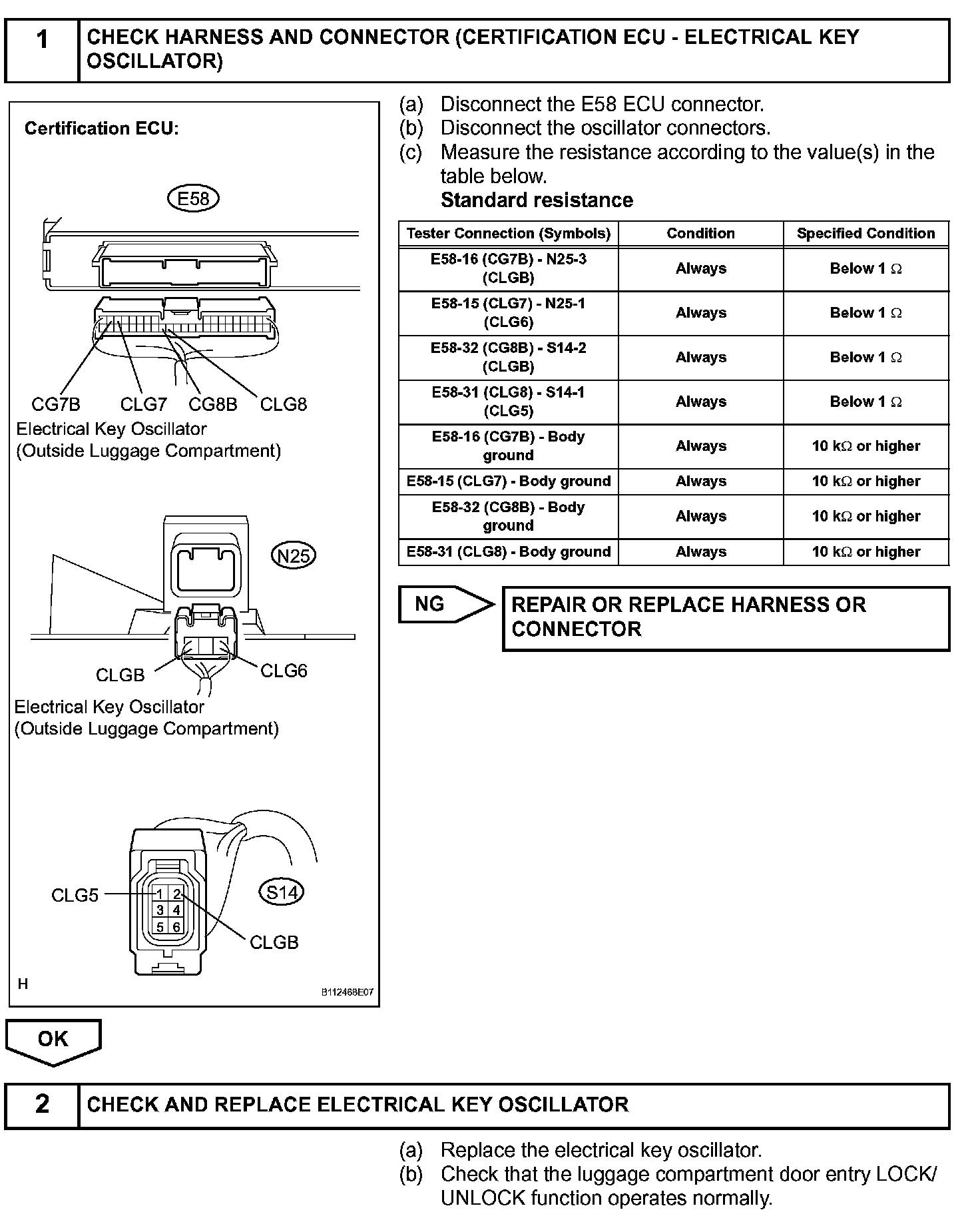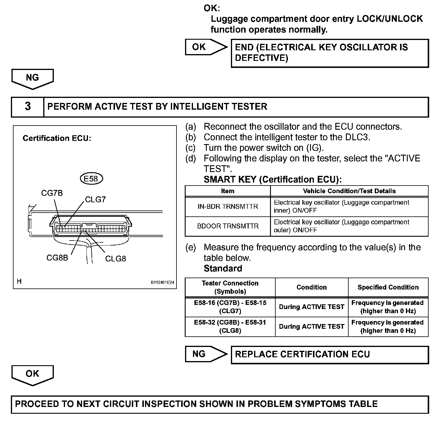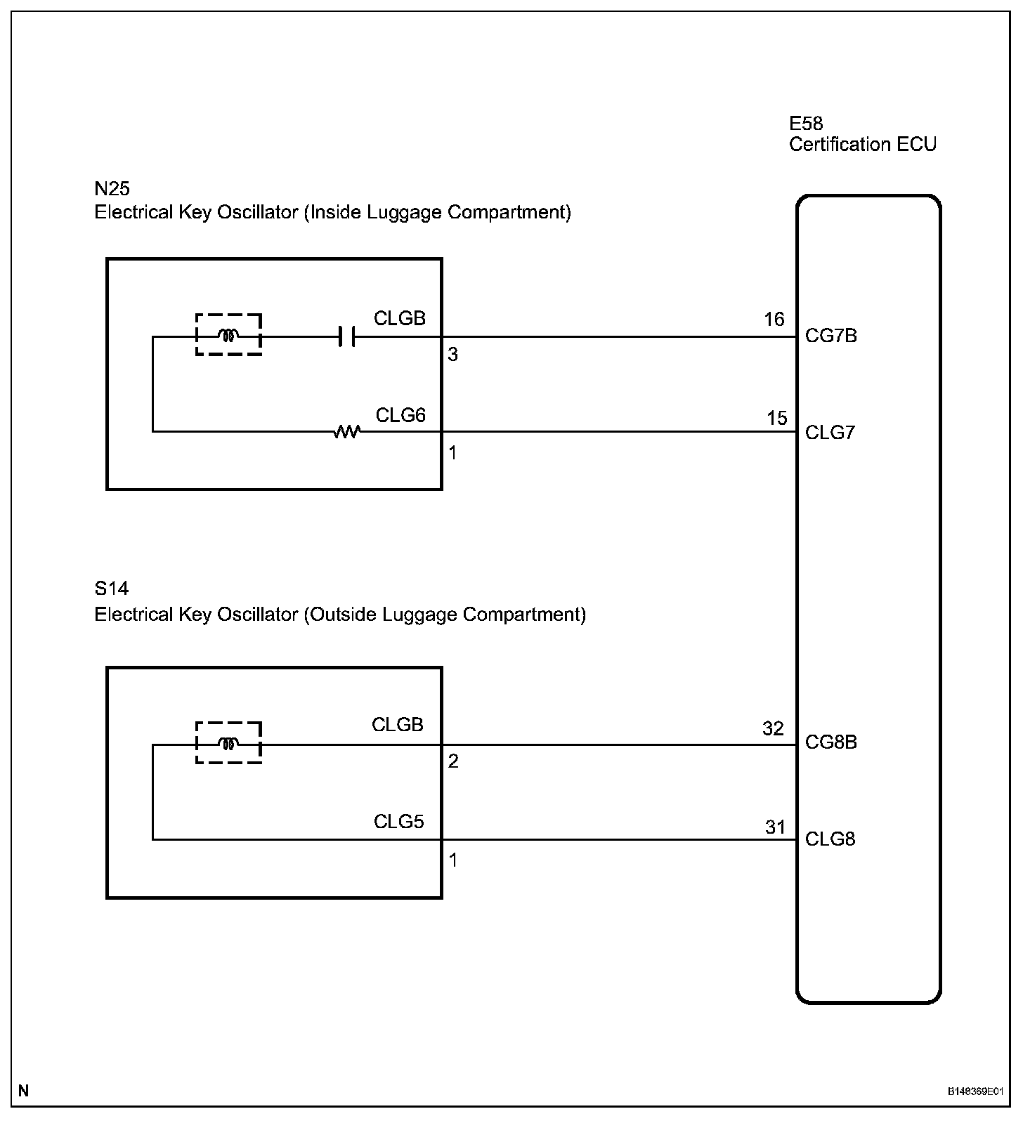 The certification ECU activates the inner and outer luggage compartment oscillators. The power is supplied from the certification ECU to both the inner and outer luggage compartment oscillators. The inner and outer luggage compartment oscillator circuits have the same wiring. If the entry luggage compartment function has a problem, check both the inner and outer luggage compartment oscillator circuits.