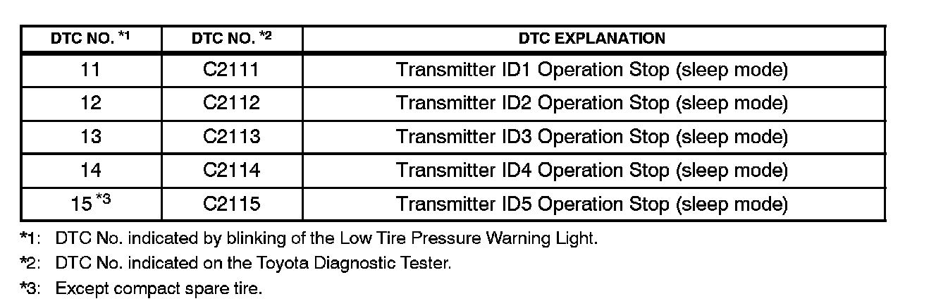 4. Check that the sleep mode DTCs are NOT stored in the system. If the sleep mode DTCs are stored, increase the tire inflation pressure of all 5 tires to 44 psi (3.0 kgm/sq.cm, 300 kpa) and repeat steps 1 - 3.