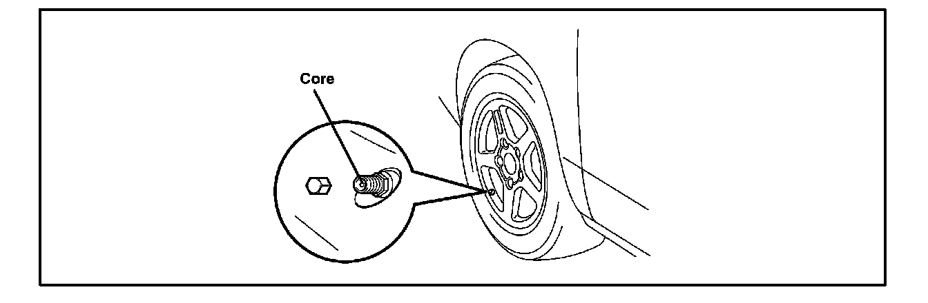 2. Press the valve core to reduce the tire inflation pressure rapidly by 6 psi (0.4 kgf/sq.cm, 40 kpa) or more within 30 seconds. If the tire inflation pressure is NOT reduced by 6 psi (0.4 kgf/sq.cm, 40 kpa) or more within 30 seconds, the tire pressure sensing transmitters will NOT be activated.