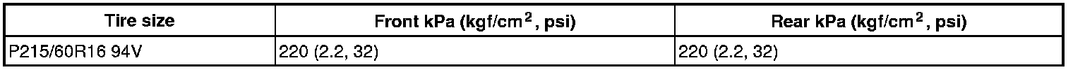 Perform the tire pressure adjustment after the vehicle has sufficiently cooled down. If the vehicle is not sufficiently cooled down, increase the air pressure by 20 to 30 kPa (0.2 to 0.3 kgf/cm2, 2.9 to 4.3 psi) above the specified value.