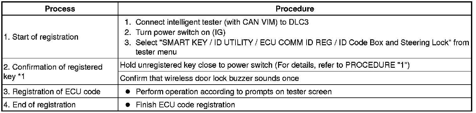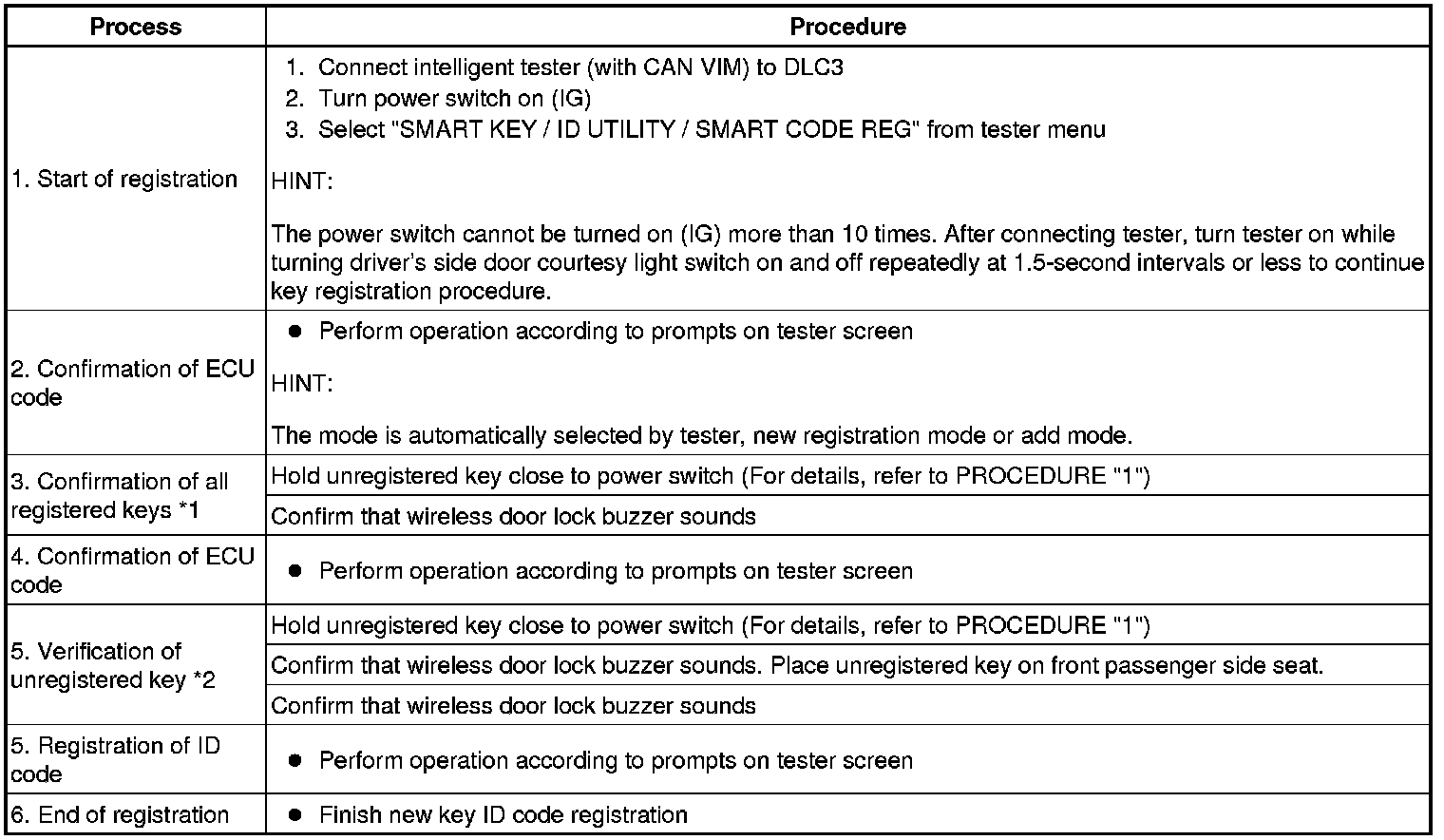- *1: Perform this process for one of the keys registered for the vehicle. Finish the procedure within 30 seconds. If the procedure has not been finished within the specified time, perform registration procedures from process 1 again.