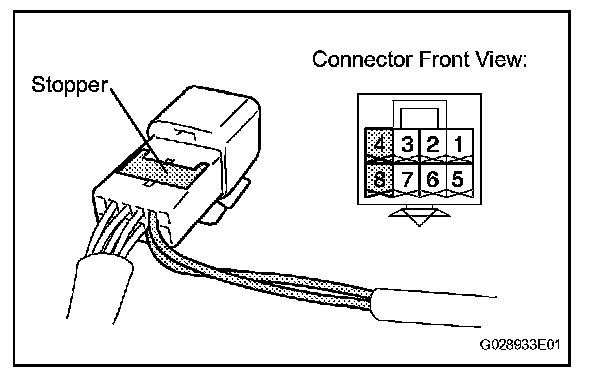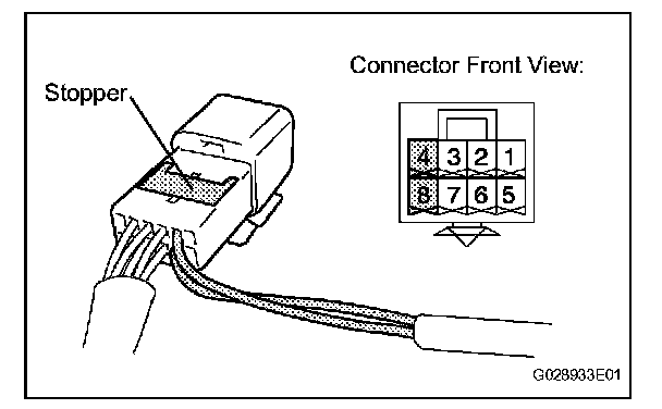 b. Using a screwdriver, disengage the locking lug of terminals (4) and (8), and pull the terminals out from the rear of the connector.
