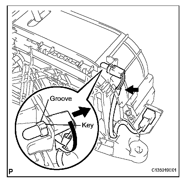 a. Insert the indicator light wire into the shift lock control unit while aligning the groove on the unit with the indicator light guide key.