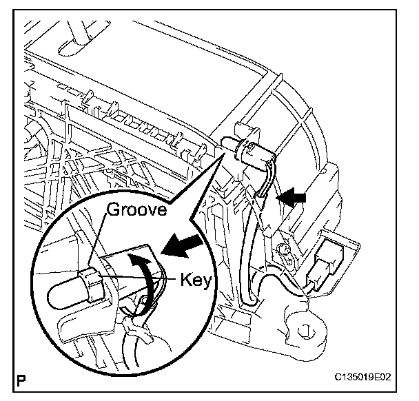 e. Align the indicator light guide key with the groove on the shift lock control unit to remove the indicator light wire.
