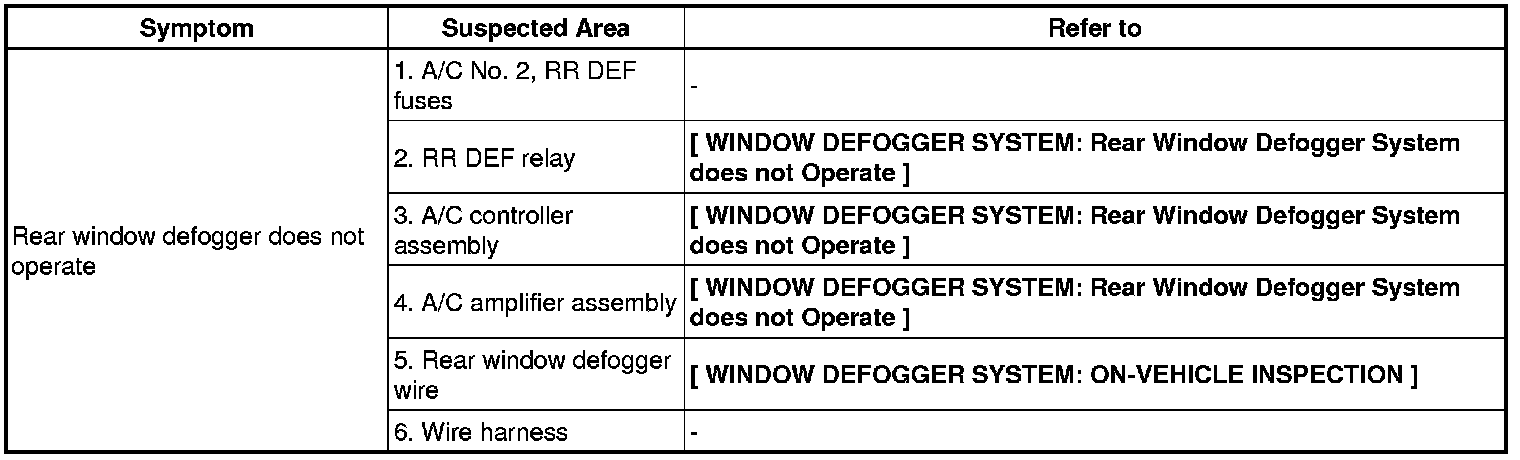 WINDSHIELD / WINDOWGLASS: WINDOW DEFOGGER SYSTEM: PROBLEM SYMPTOMS TABLE