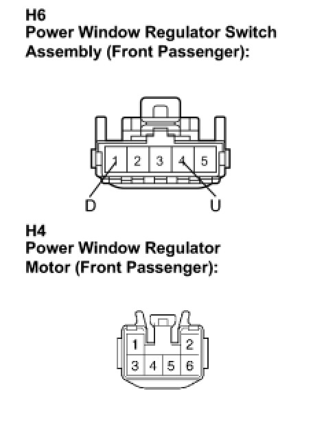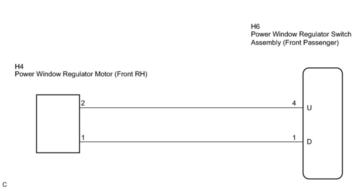 This circuit transmits signals from the power window regulator switch assembly (Front RH) to the power window regulator motor (Front RH).