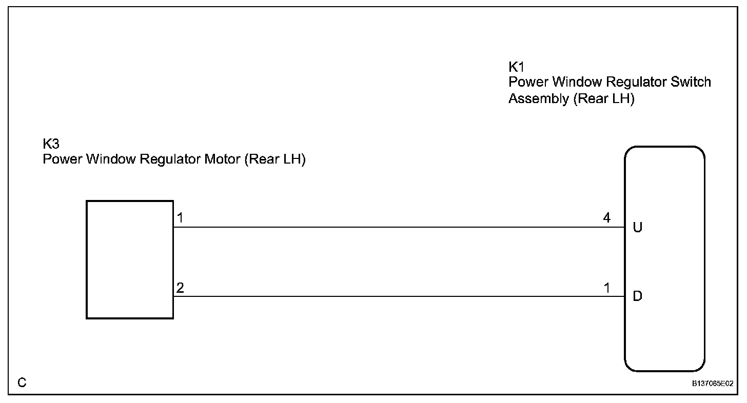 This circuit transmits signals from the power window regulator switch assembly (Rear LH) to the power window regulator motor (Rear LH).