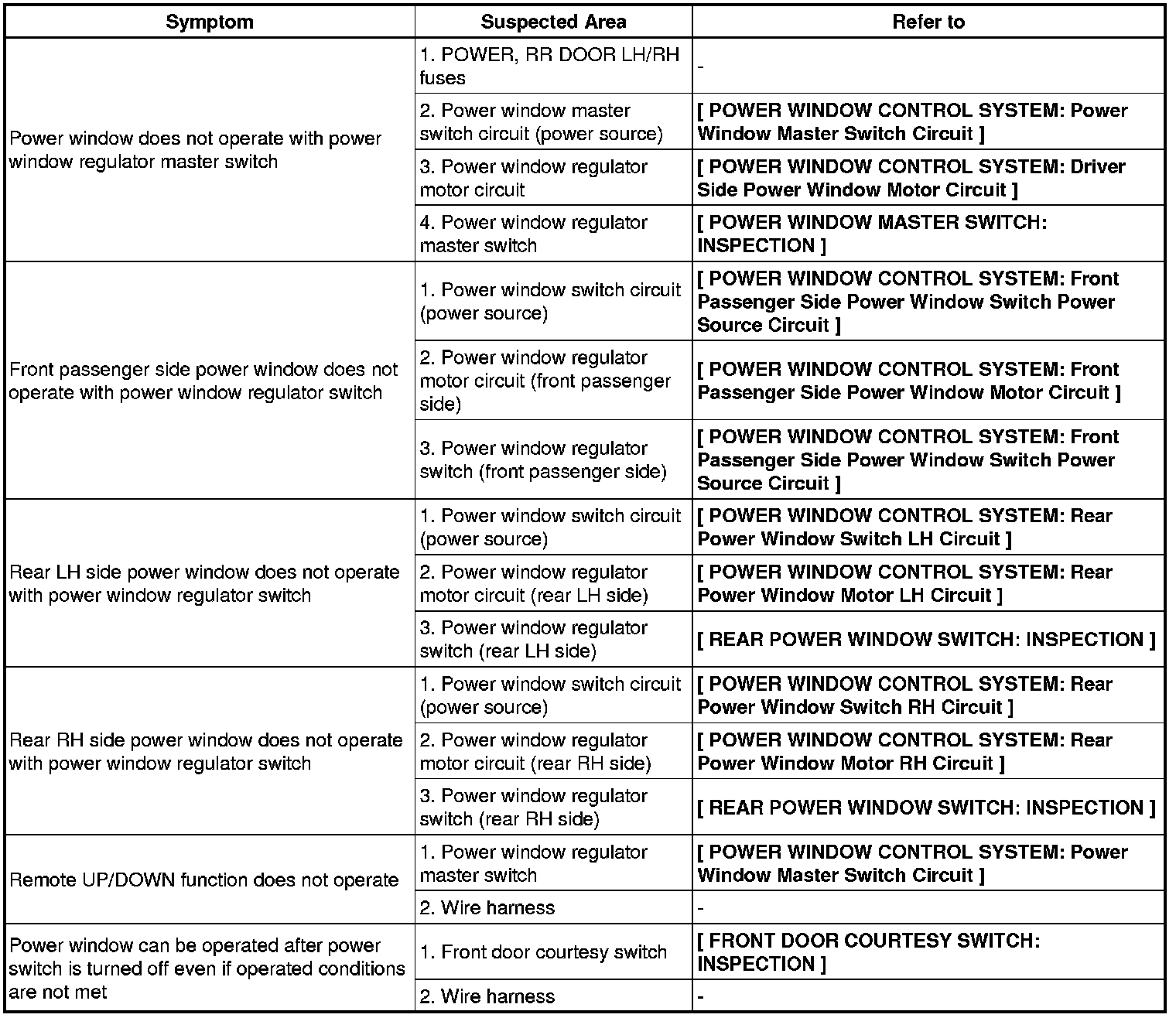 / WINDOWGLASS: POWER WINDOW CONTROL SYSTEM: PROBLEM SYMPTOMS TABLE