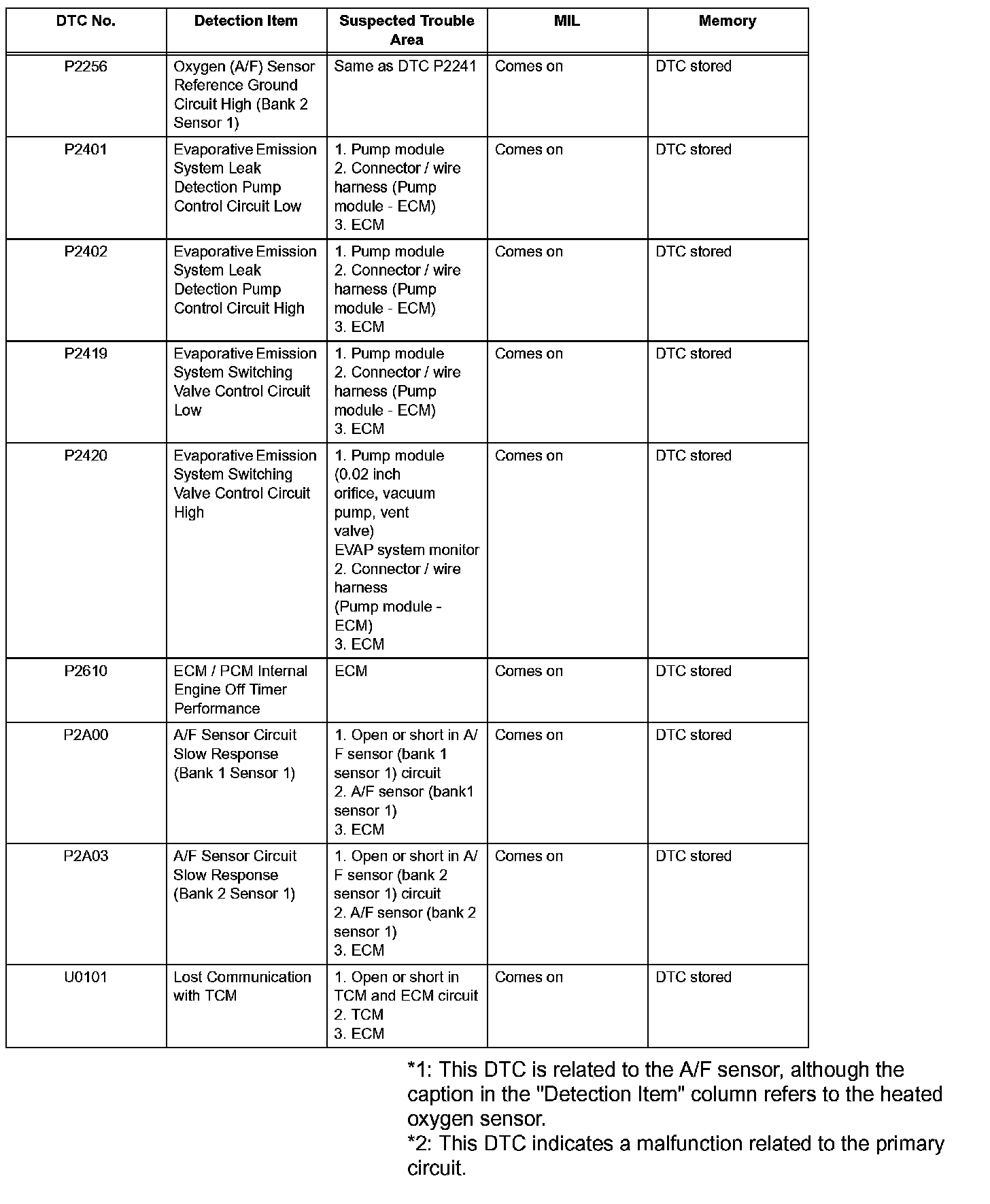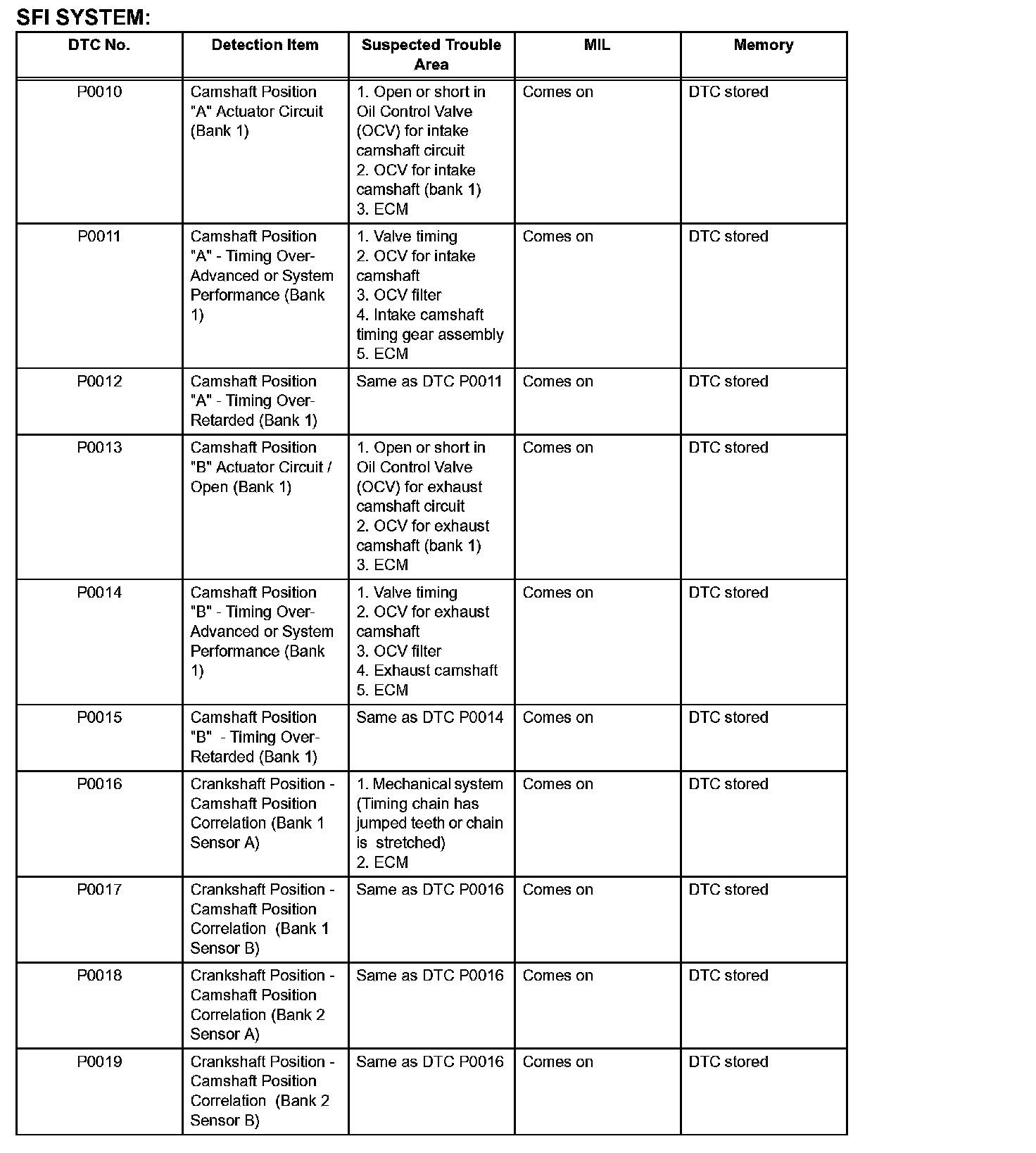 DIAGNOSTIC TROUBLE CODE CHARTP0010-P0019: