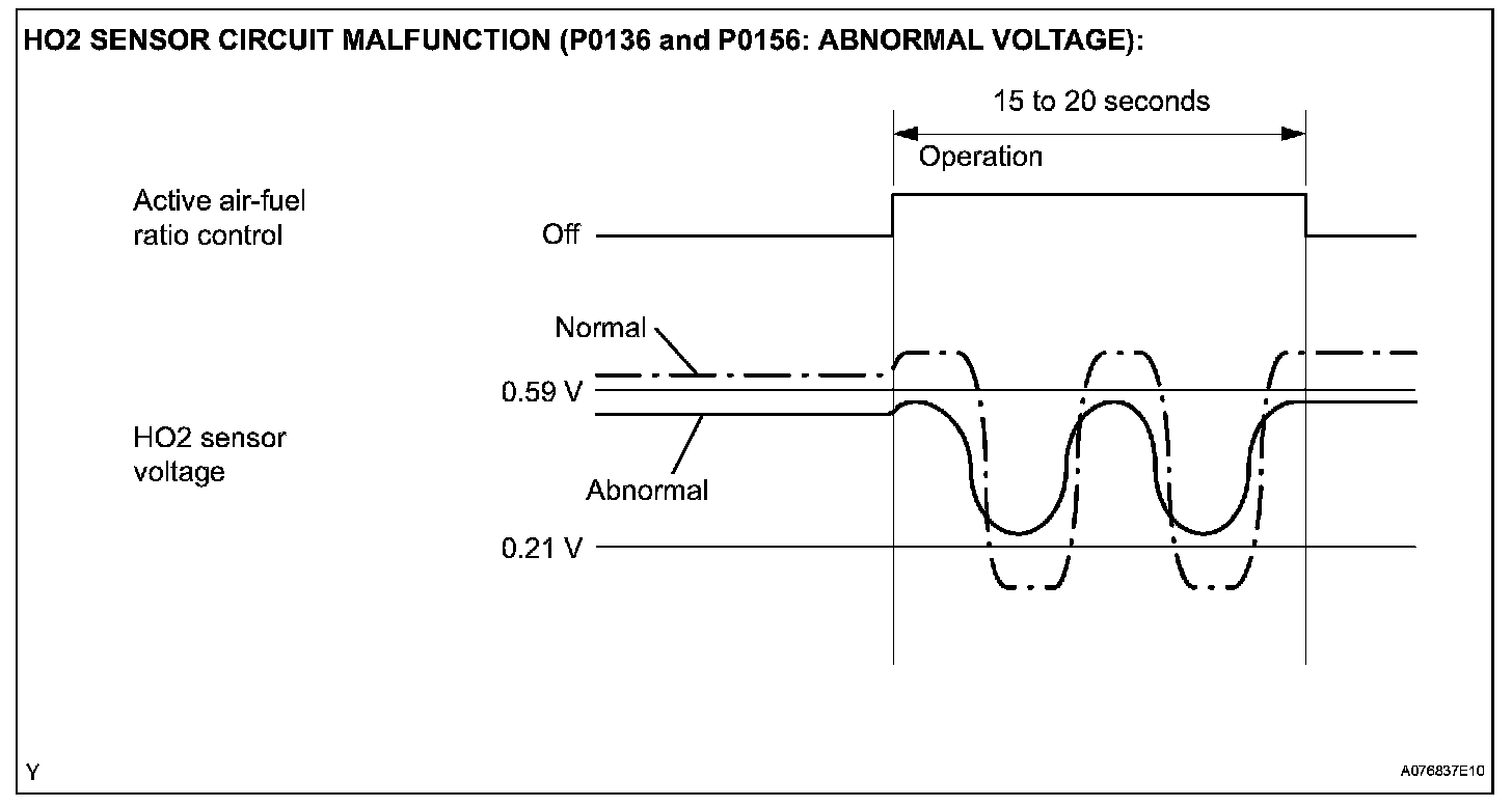 While the ECM is performing active air-fuel ratio control, the air-fuel ratio is forcibly regulated to become rich or lean. If the sensor is not functioning properly, the voltage output variation is small. For example, when the HO2 sensor voltage does not decrease to less than 0.21 V and does not increase to more than 0.59 V during active air-fuel ratio control, the ECM determines that the sensor voltage output is abnormal and sets DTCs P0136 and P0156.