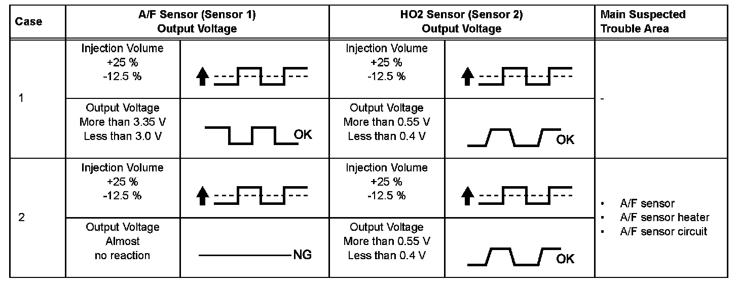 Malfunctioning areas can be identified by performing the A/F CONTROL function provided in the ACTIVE TEST. The A/F CONTROL function can help to determine whether the Air-Fuel Ratio (A/F) sensor, Heated Oxygen (HO2) sensor and other potential trouble areas are malfunctioning.