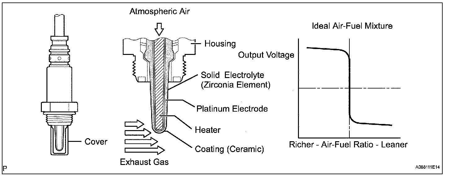 The sensing position of the Heated Oxygen (HO2) sensor has a zirconia element which is used to detect the oxygen concentration in the exhaust gas. If the zirconia element is at the appropriate temperature, and the difference between the oxygen concentrations surrounding the inside and outside surfaces of the sensor is large, the zirconia element generates voltage signals. In order to increase the oxygen concentration detecting capacity of the zirconia element, the ECM supplements the heat from the exhaust with heat from a heating element inside the sensor.