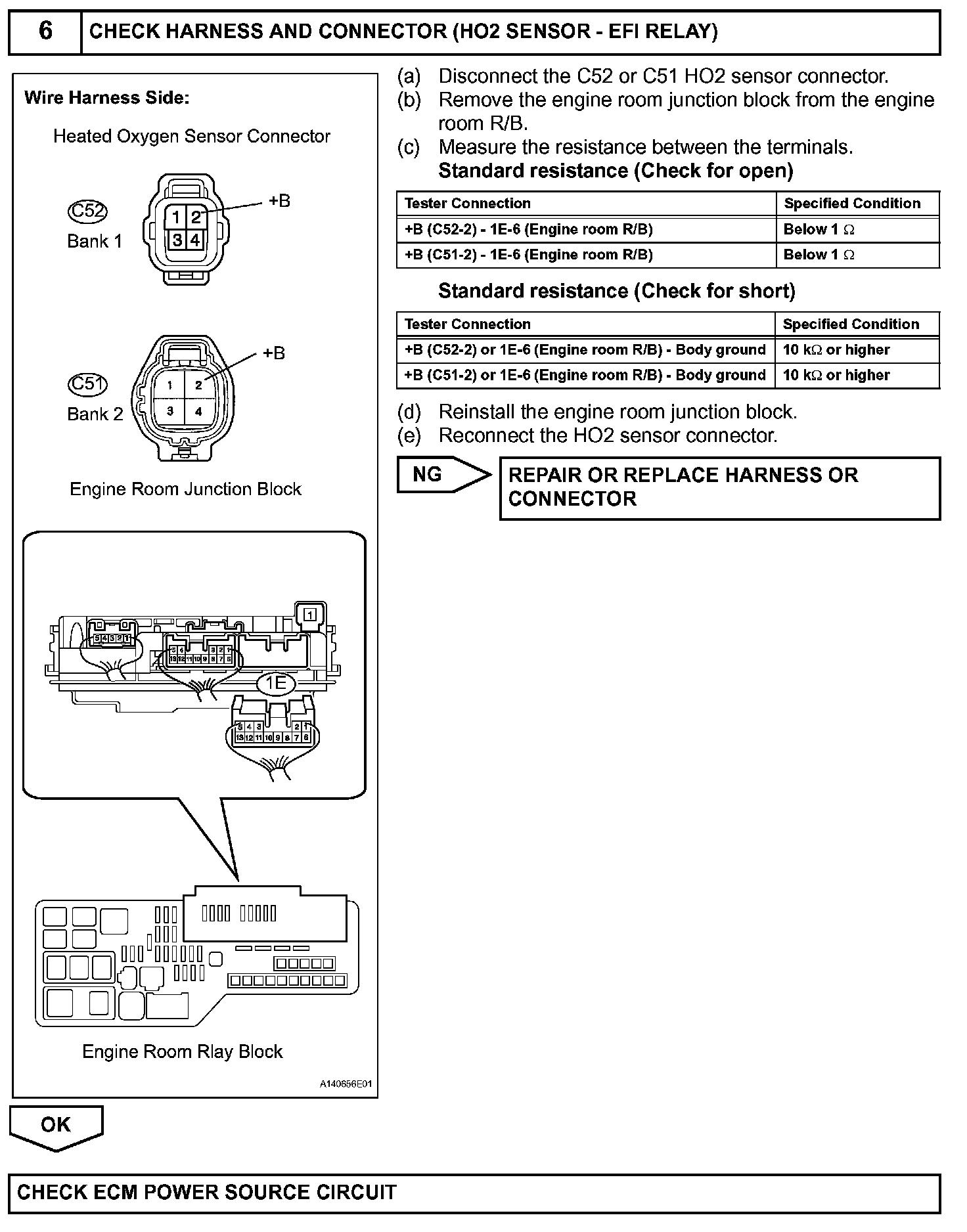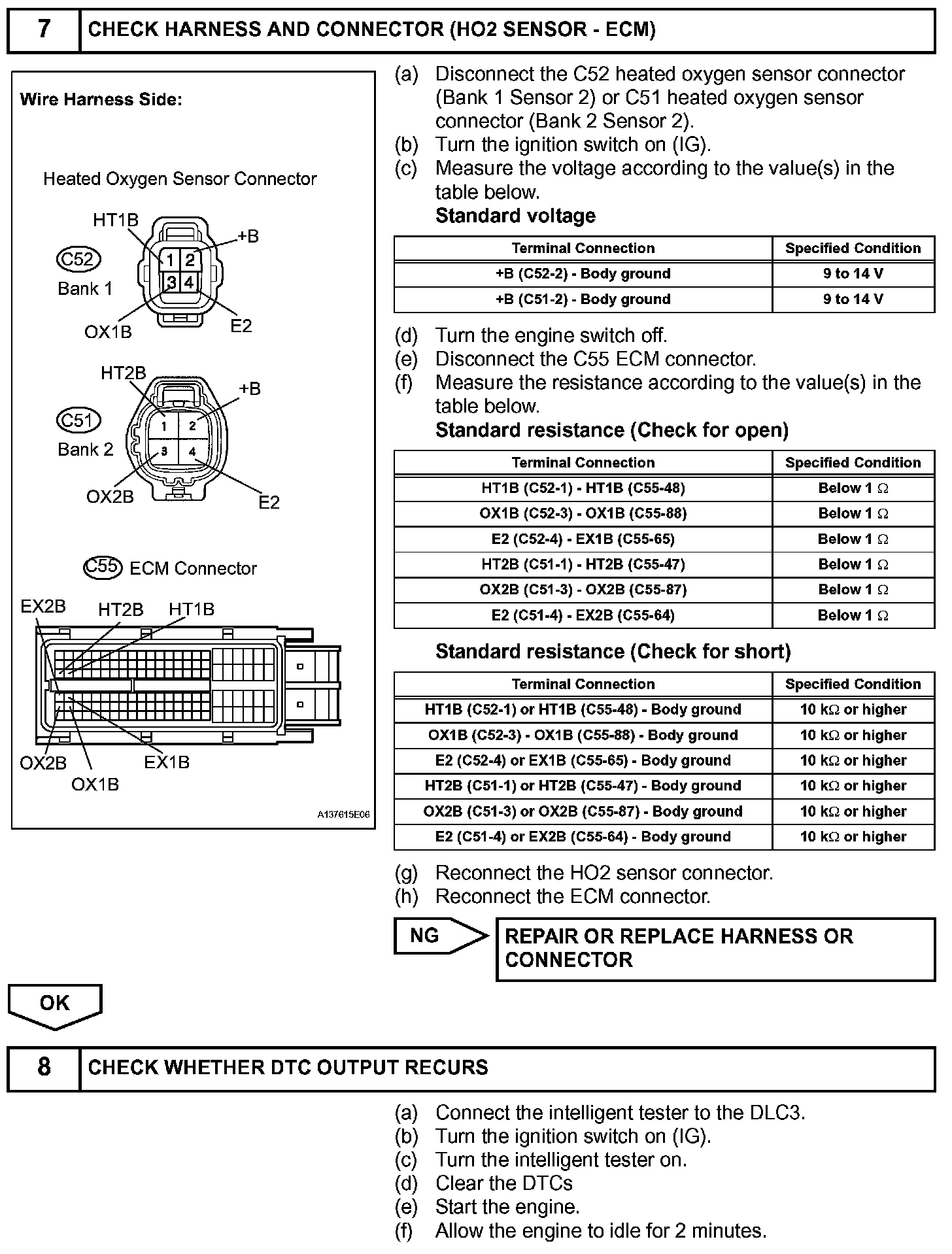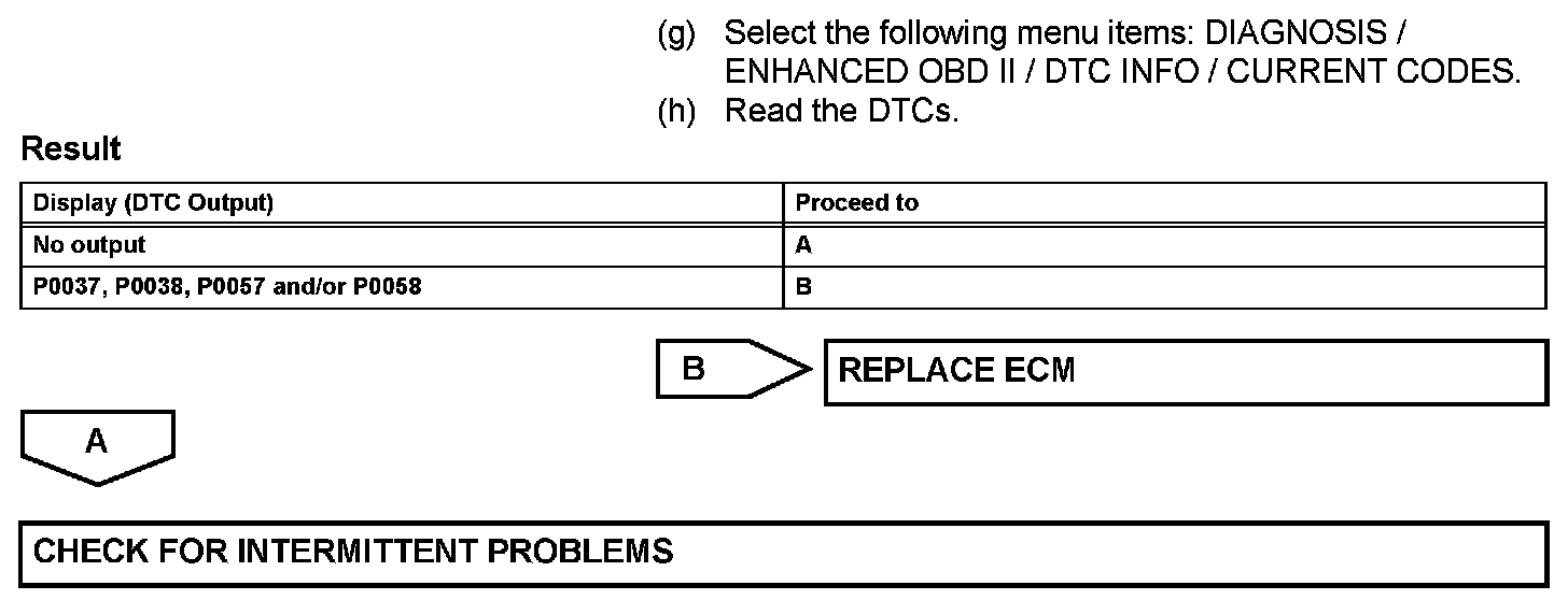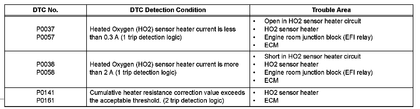 The ECM sets DTC P0038 or P0058 when the current in the HO2 sensor heater is more than 2 A. Conversely, when the heater current is less than 0.3 A, DTC P0037 or P0057 is set.
