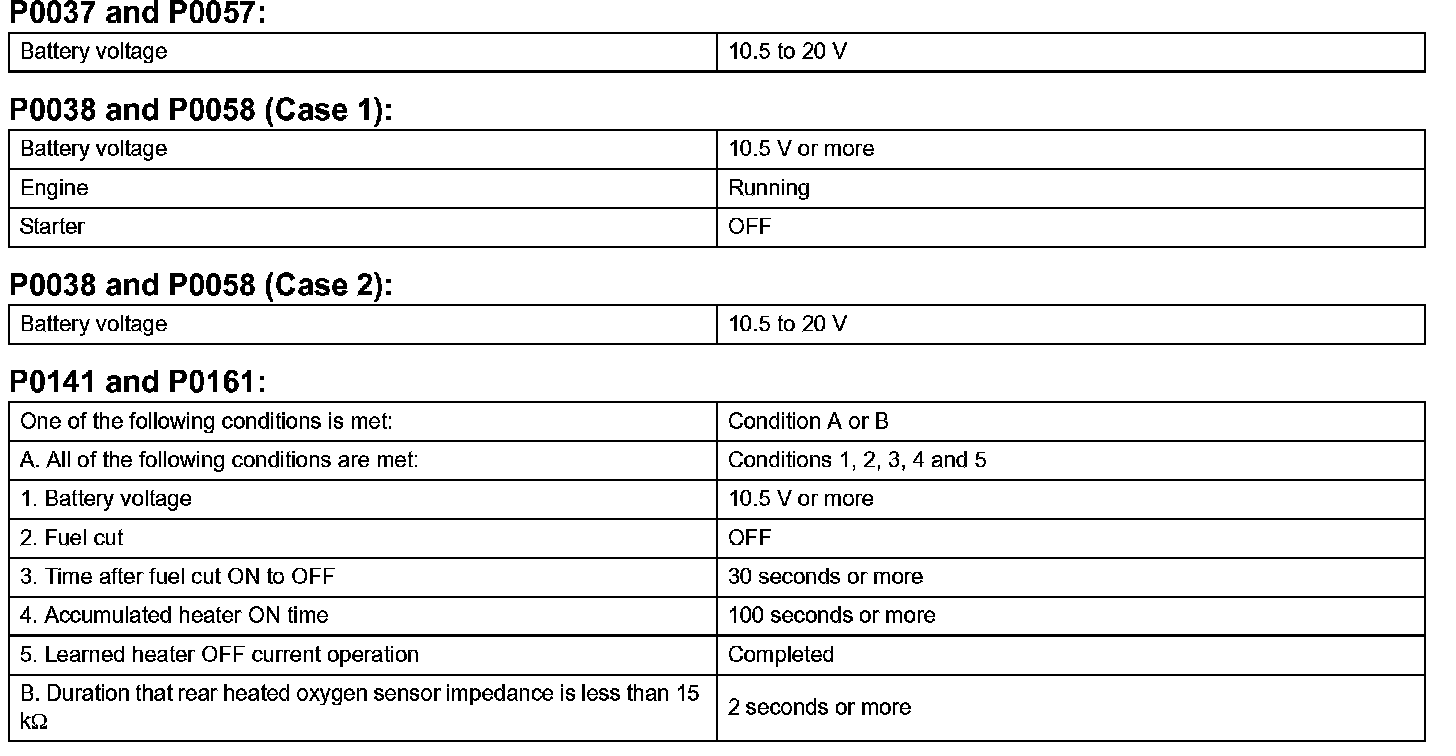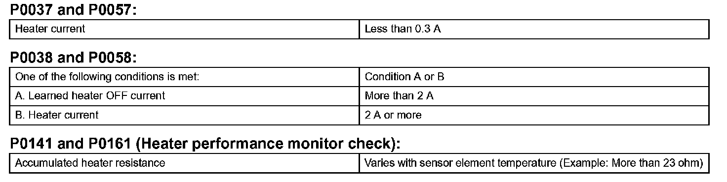 Heated oxygen sensor heater range check (P0037,P0038, P0057 and P0058):