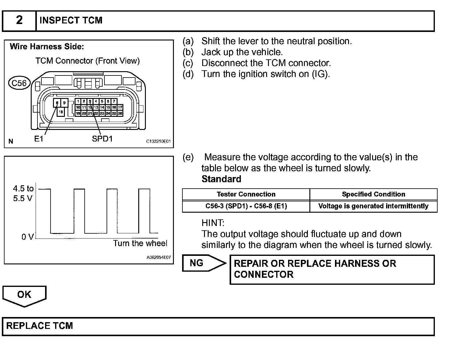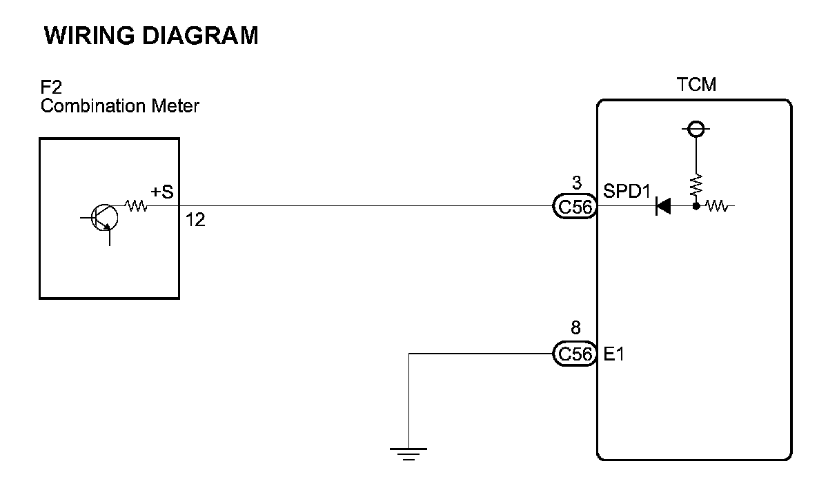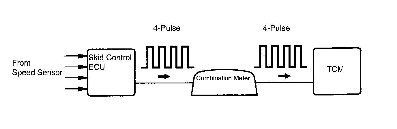 The skid control ECU converts these wheel speed signals into a 4-pulse signal and outputs it to the TCM via the combination meter. The TCM determines the vehicle speed based on the frequency of these pulse signals.