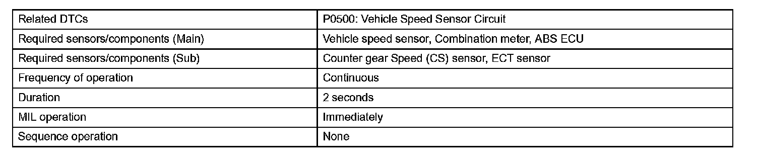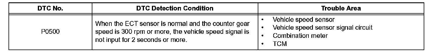 The TCM assumes that the vehicle is being driven when the transmission counter gear indicates more than 300 rpm and over 30 seconds have passed since the park/neutral position switch was turned off. If there is no signal from the vehicle speed sensor with these conditions satisfied, the TCM concludes that the vehicle speed sensor is malfunctioning. The TCM will turn on the MIL and a DTC will be set.