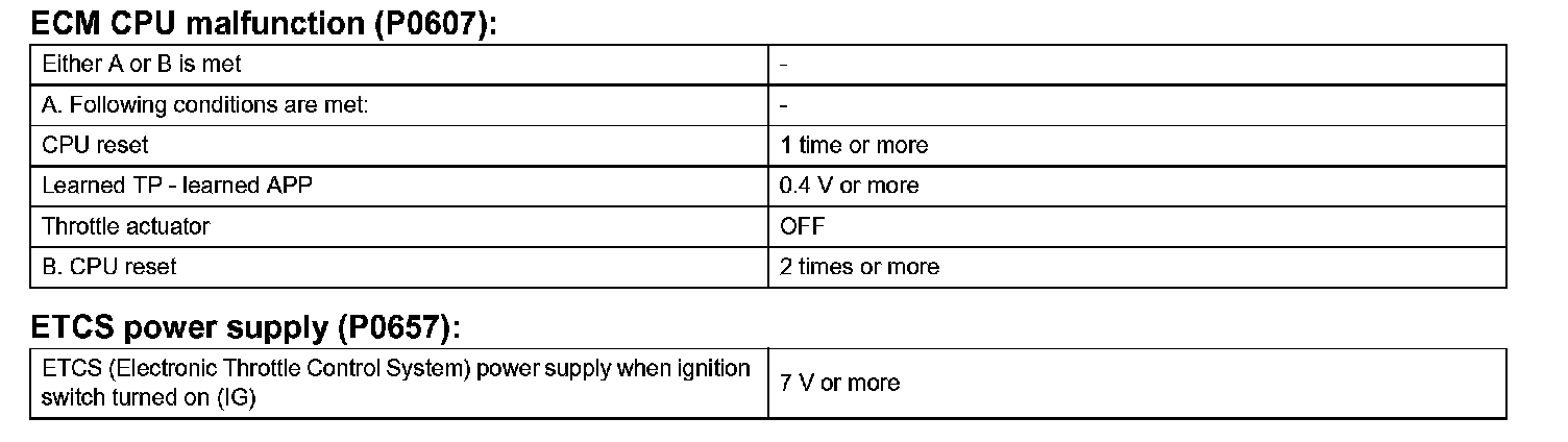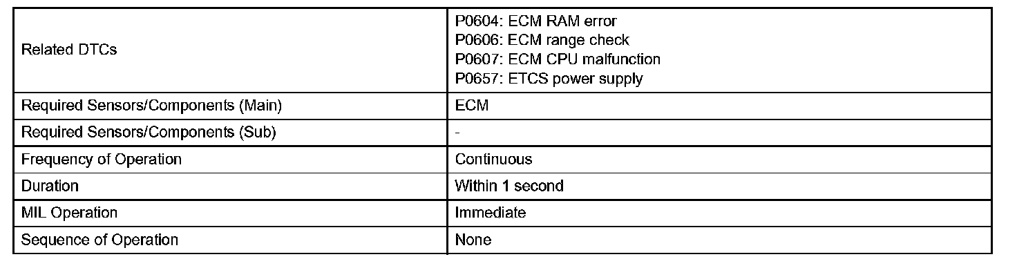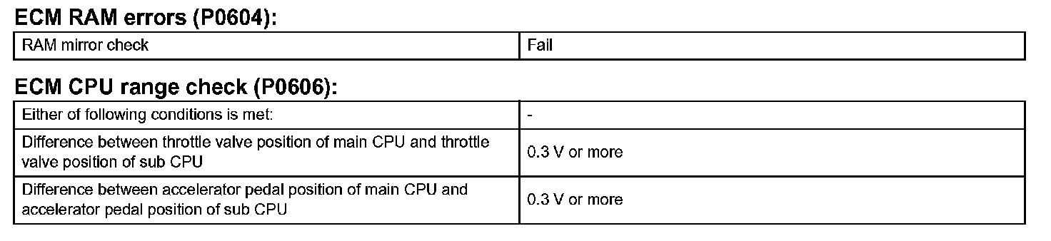 The ECM memory status is diagnosed by internal "mirroring" of the main CPU and the sub CPU to detect Random Access Memory (RAM) errors. The 2 CPUs also perform continuous mutual monitoring. The ECM illuminates the MIL and sets a DTC if: 1) outputs from the 2 CPUs are different and deviate from the standards, 2) the signals sent to the throttle actuator deviate from the standards, 3) a malfunction is found in the throttle actuator supply voltage, and 4) any other ECM malfunction is found.