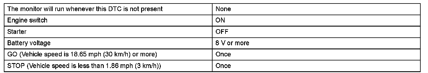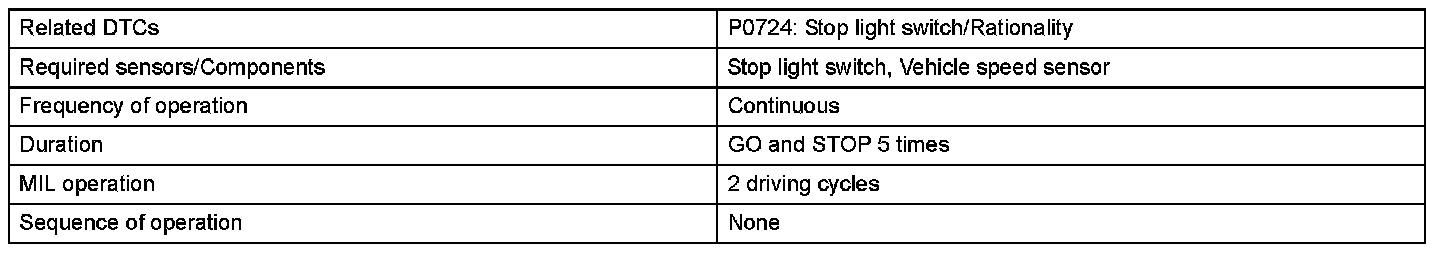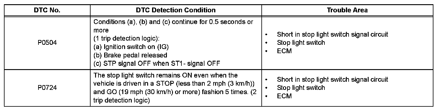 This DTC indicates that the stop light switch remains on. When the stop light switch remains ON during "stop and go" driving, the ECM interprets this as a fault in the stop light switch and the MIL comes on and the ECM stores the DTC. The vehicle must stop (less than 2 mph (3 km/h)) and go (19 mph (30 km/h) or more) 5 times in two driving cycles in order to detect a malfunction.