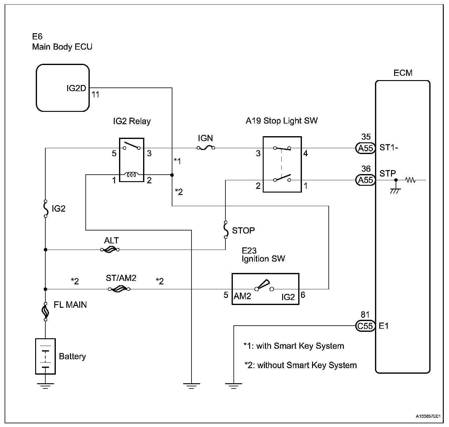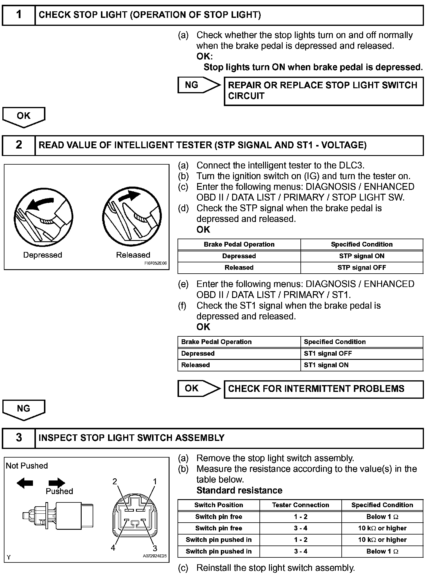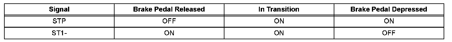 The stop light switch is a duplex system that transmits two signals: STP and ST1-. These two signals are used by the ECM to monitor whether or not the brake system is working properly. If the signals, which indicate the brake pedal is being depressed and released, are detected simultaneously, the ECM interprets this as a malfunction in the stop light switch and sets the DTC.