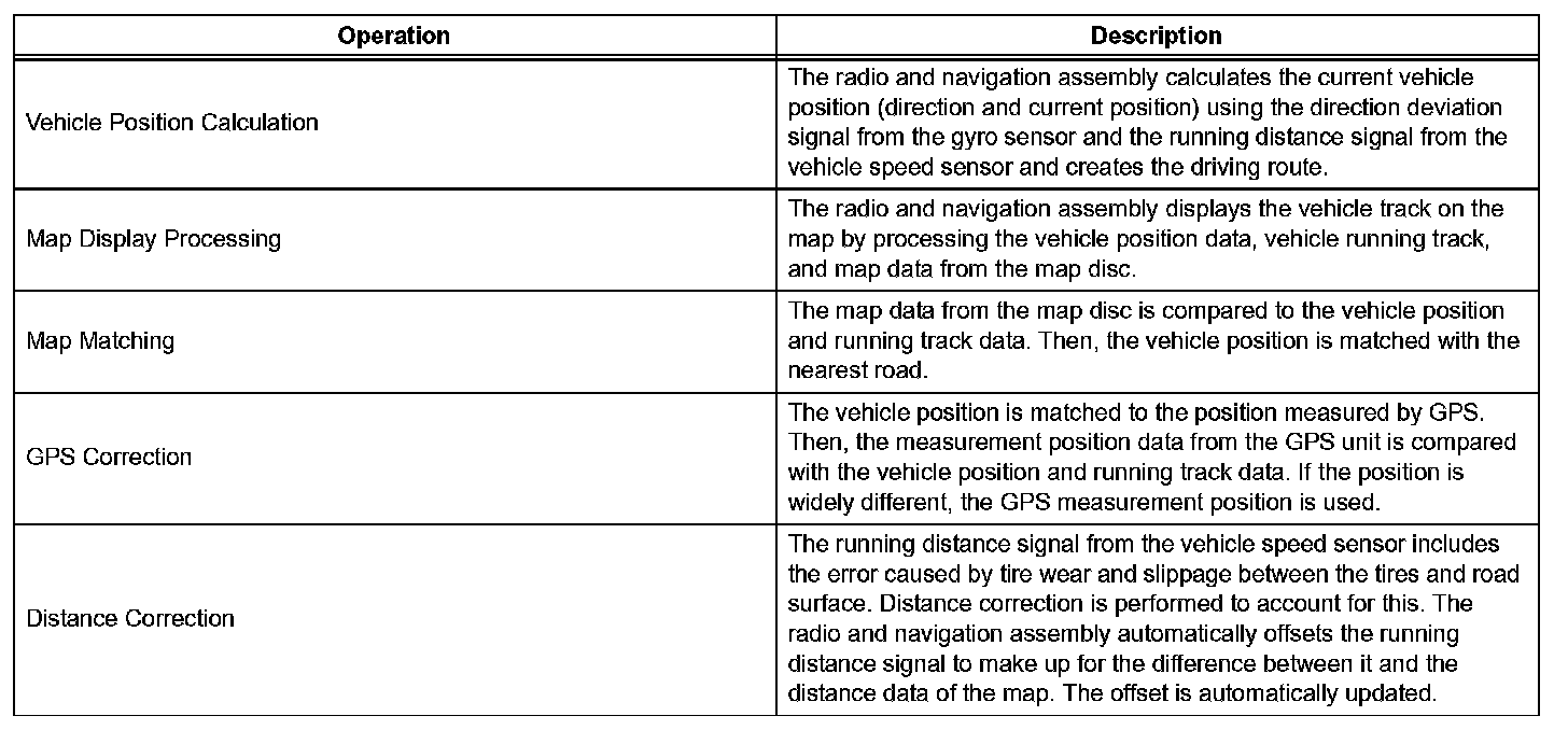The current driving route is calculated by autonomous navigation (according to the gyro sensor and vehicle speed sensor) and GPS navigation. This information is then compared with possible road shapes from the map data in the map disc and the vehicle position is set onto the most appropriate road.