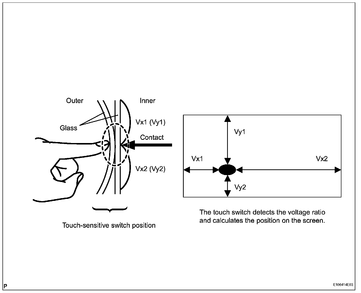Touch switches are touch-sensitive (interactive) switches operated by touching the screen. When a switch is pressed, the outer glass bends in to contact the inner glass at the pressed position. By doing this, the voltage ratio is measured and the pressed position is detected.