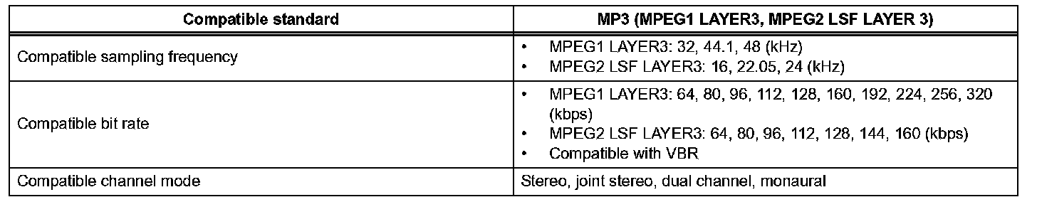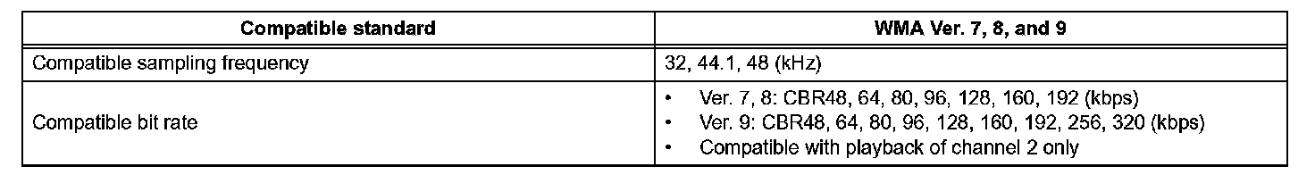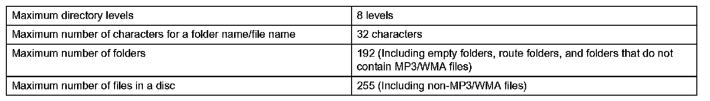 - As for MP3/WMA files written in any format other than those above, the contents of the files may not be played normally or the file names or folder names may not be displayed correctly.