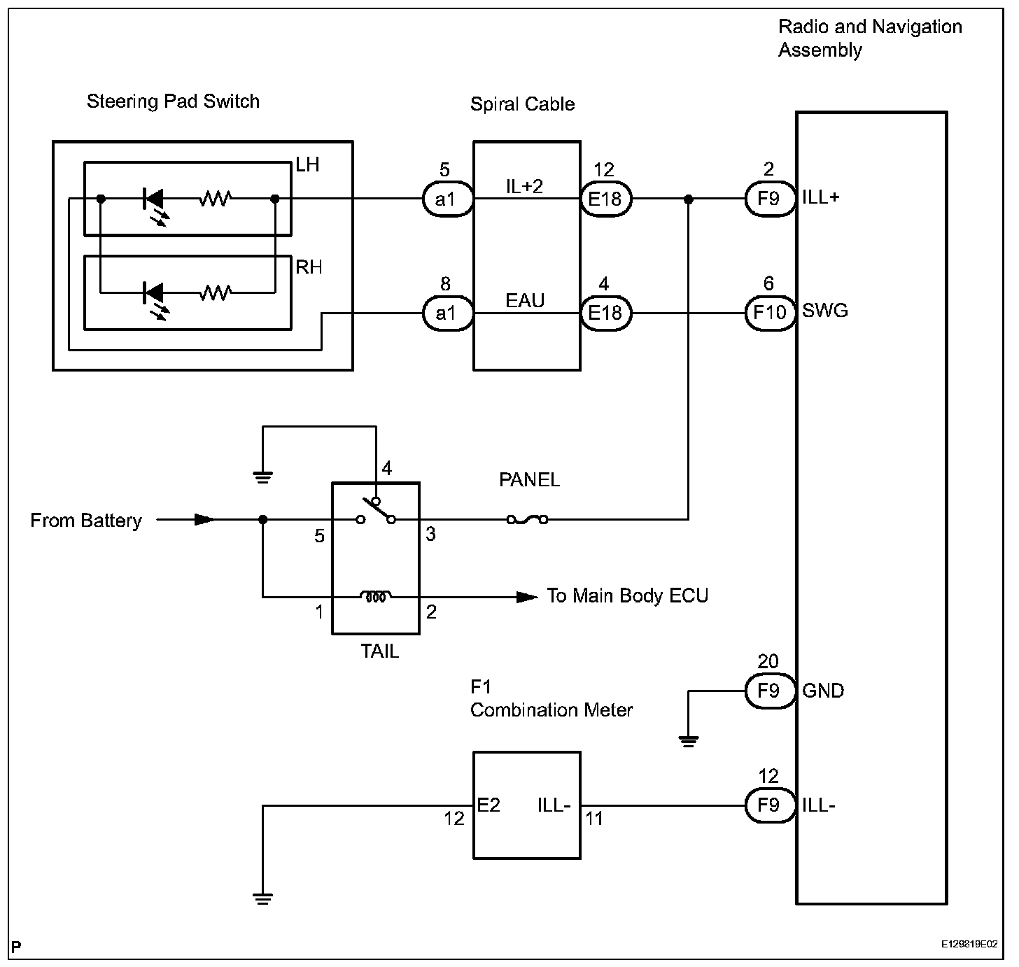 Power is supplied to the radio and navigation assembly and steering pad switch illumination when the light control switch is in the TAIL or HEAD position.