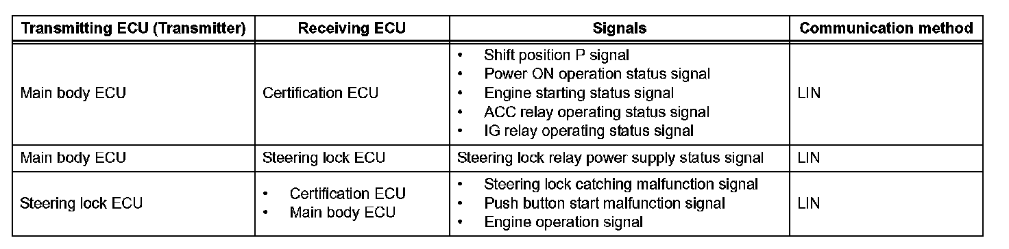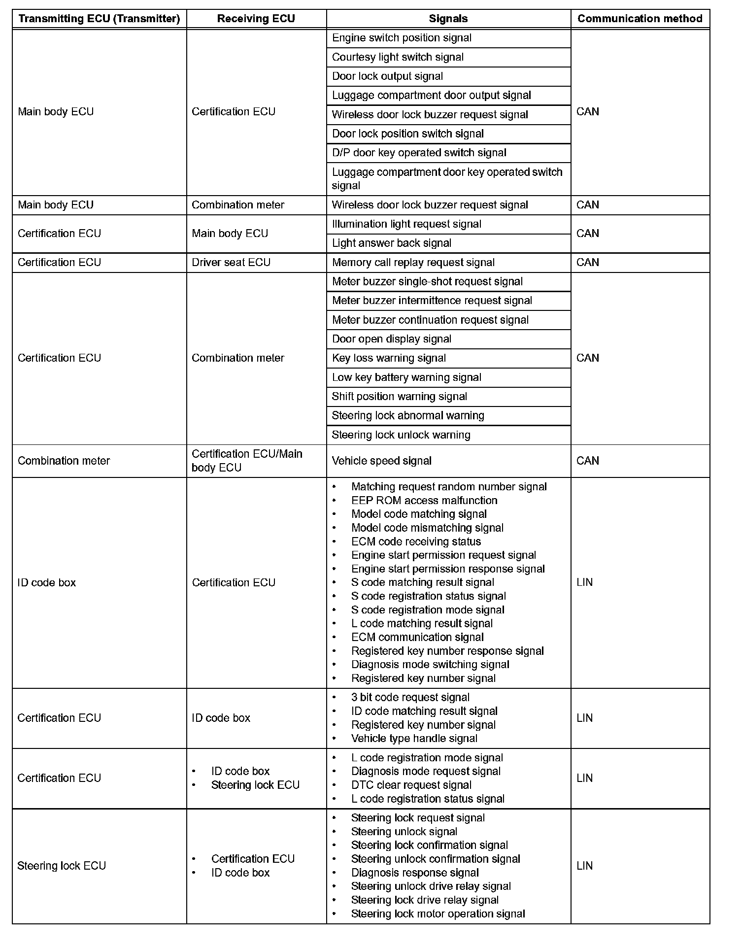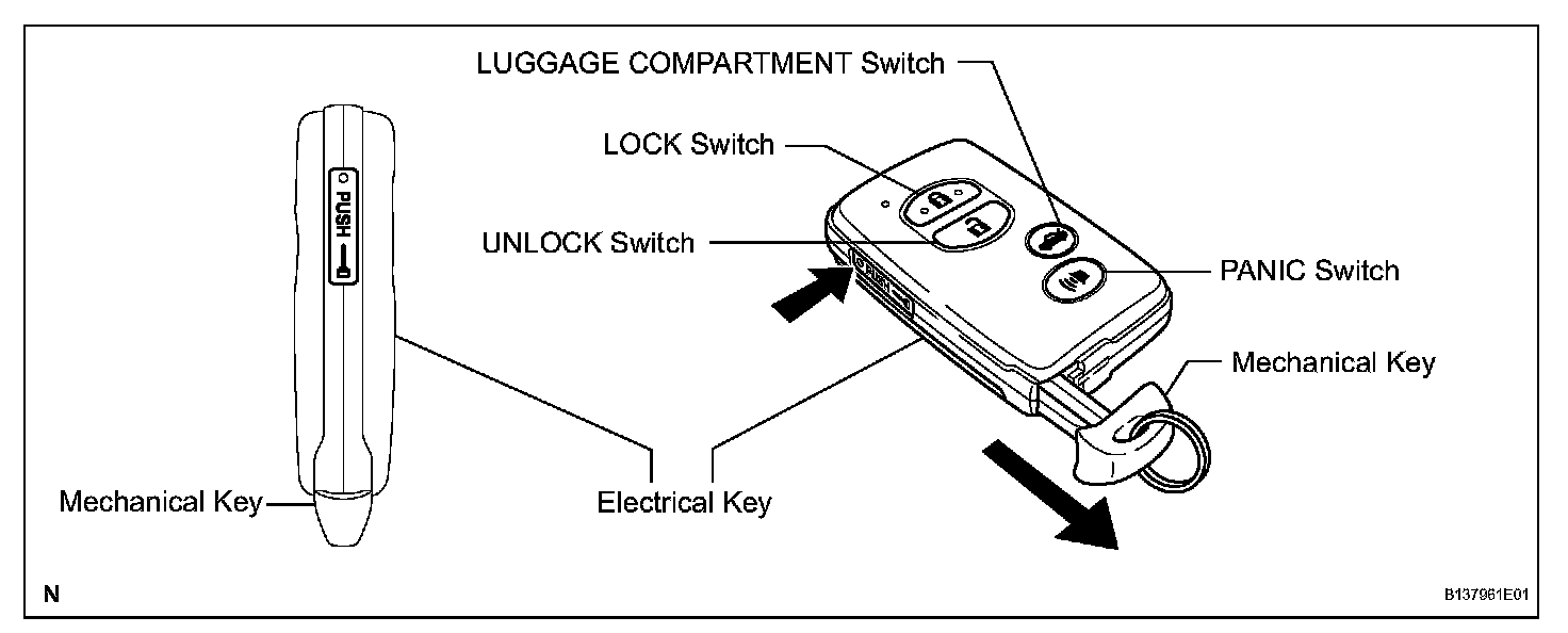 a. In addition to conventional mechanical key and wireless door lock control functions, the smart key system enables door locking/unlocking, steering lock releasing, engine starting, and luggage compartment door opening without operating the electrical key. The only requirement is that the electrical key is in the user's possession.