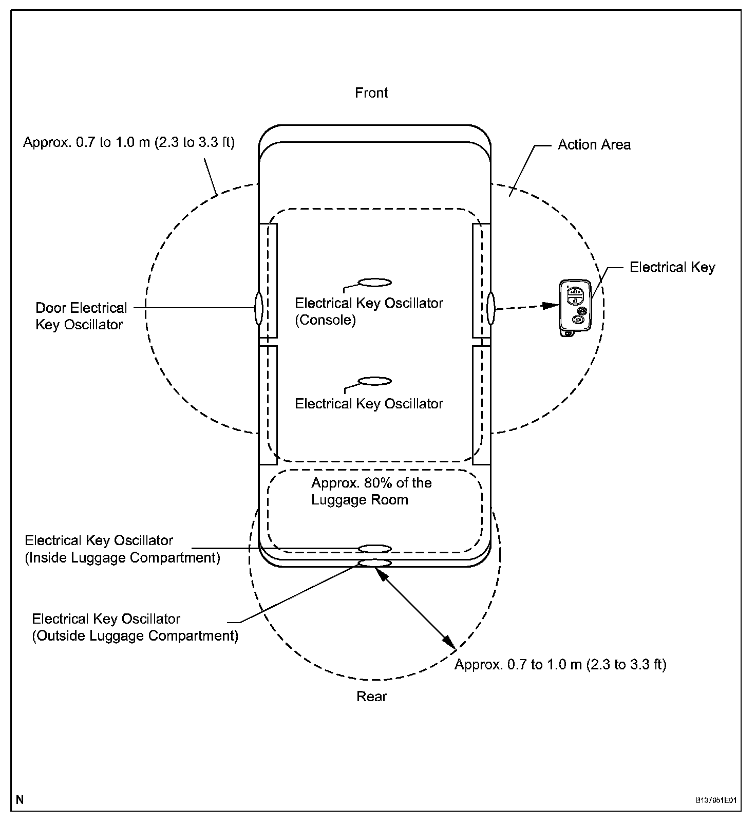b. Oscillator (front door oscillator, front and rear indoor oscillator, luggage compartment inner oscillator, luggage compartment outer oscillator) Each oscillator transmits the request signal received from the certification ECU, and forms an electrical key detection area to detect the presence of an electrical key. The detection area formed by front door oscillator and luggage compartment outer oscillator is approximately 0.7 to 1.0 m (2.3 to 3.3 ft) from the outside handle of front door or the center of the rear bumper.