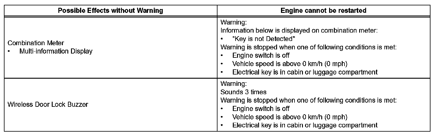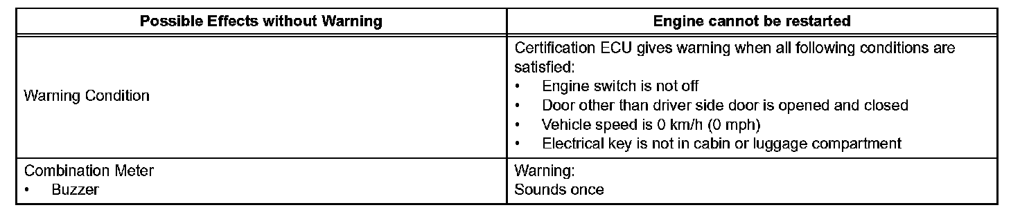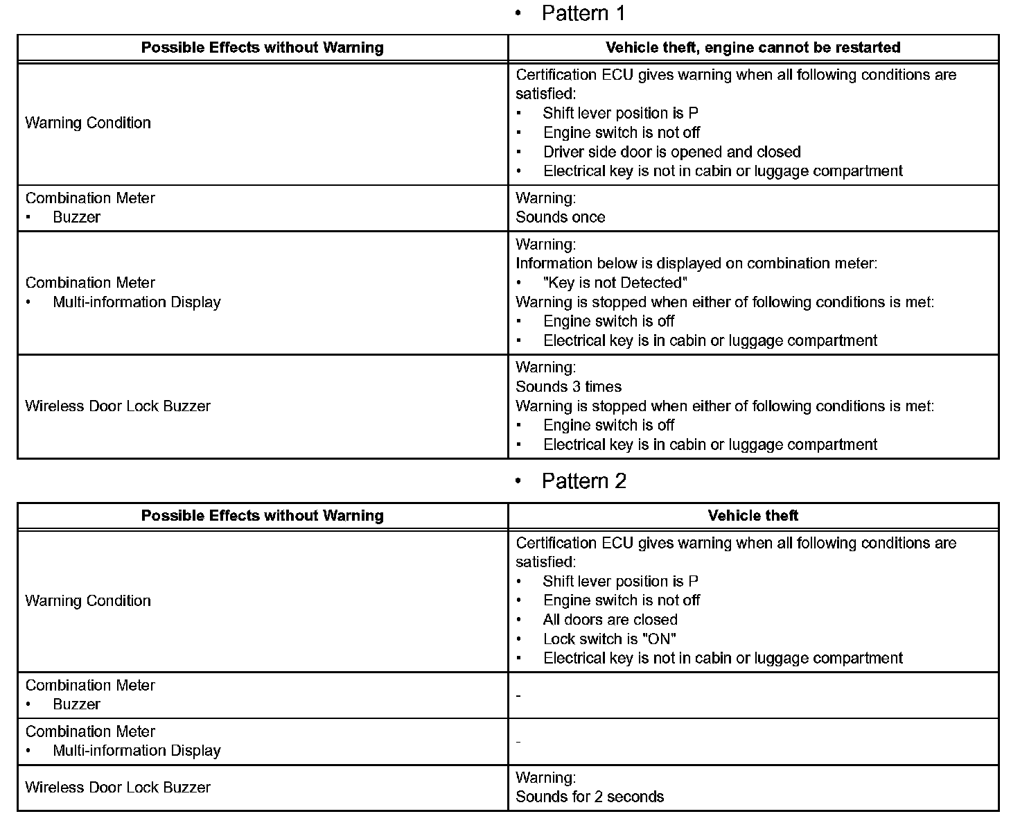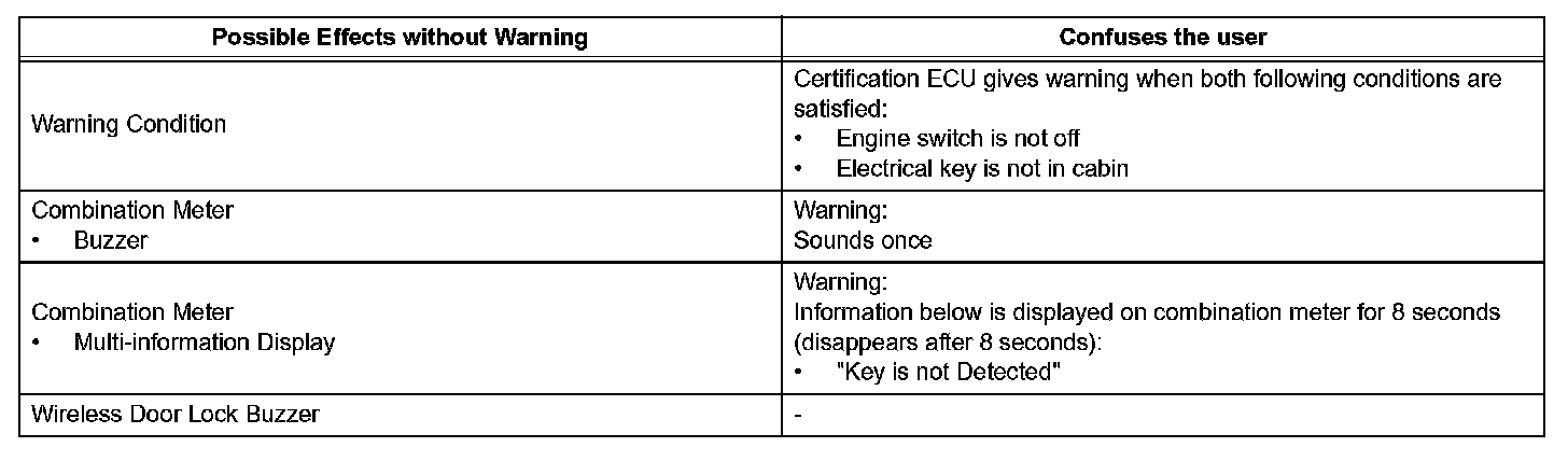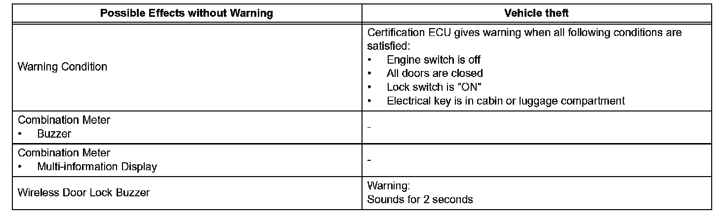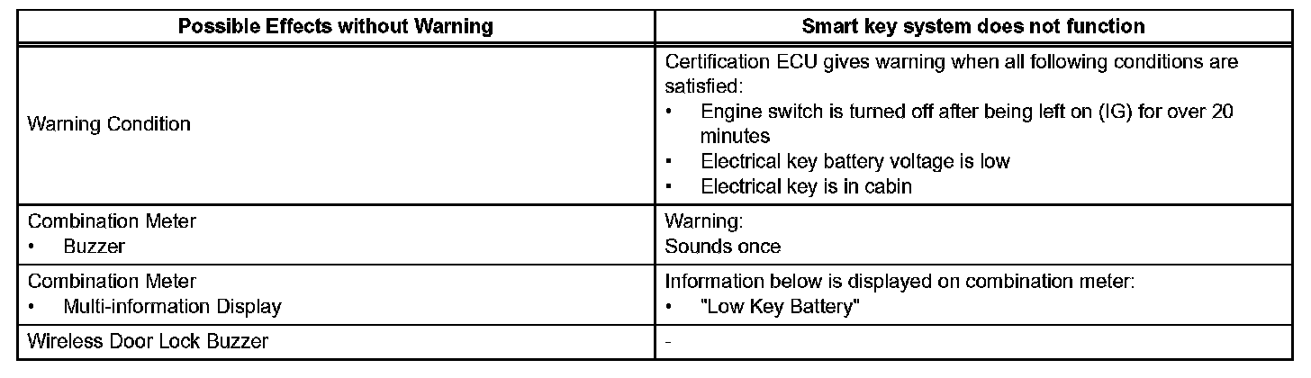 a. General When any of the situations occur, the smart key system causes the certification ECU to sound the buzzer in the combination meter and the wireless door lock buzzer, and illuminate the combination meter's multi-information display in order to alert the driver.