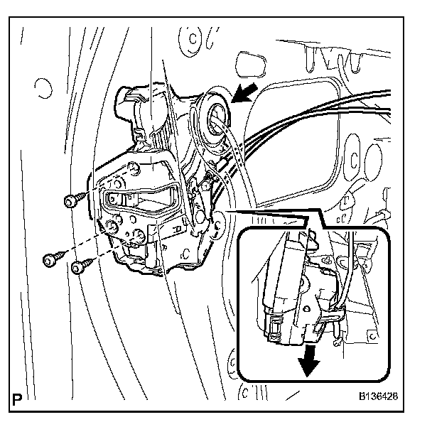 h. Using a "torx" socket wrench (T30), install the front door lock assembly with the 3 screws.