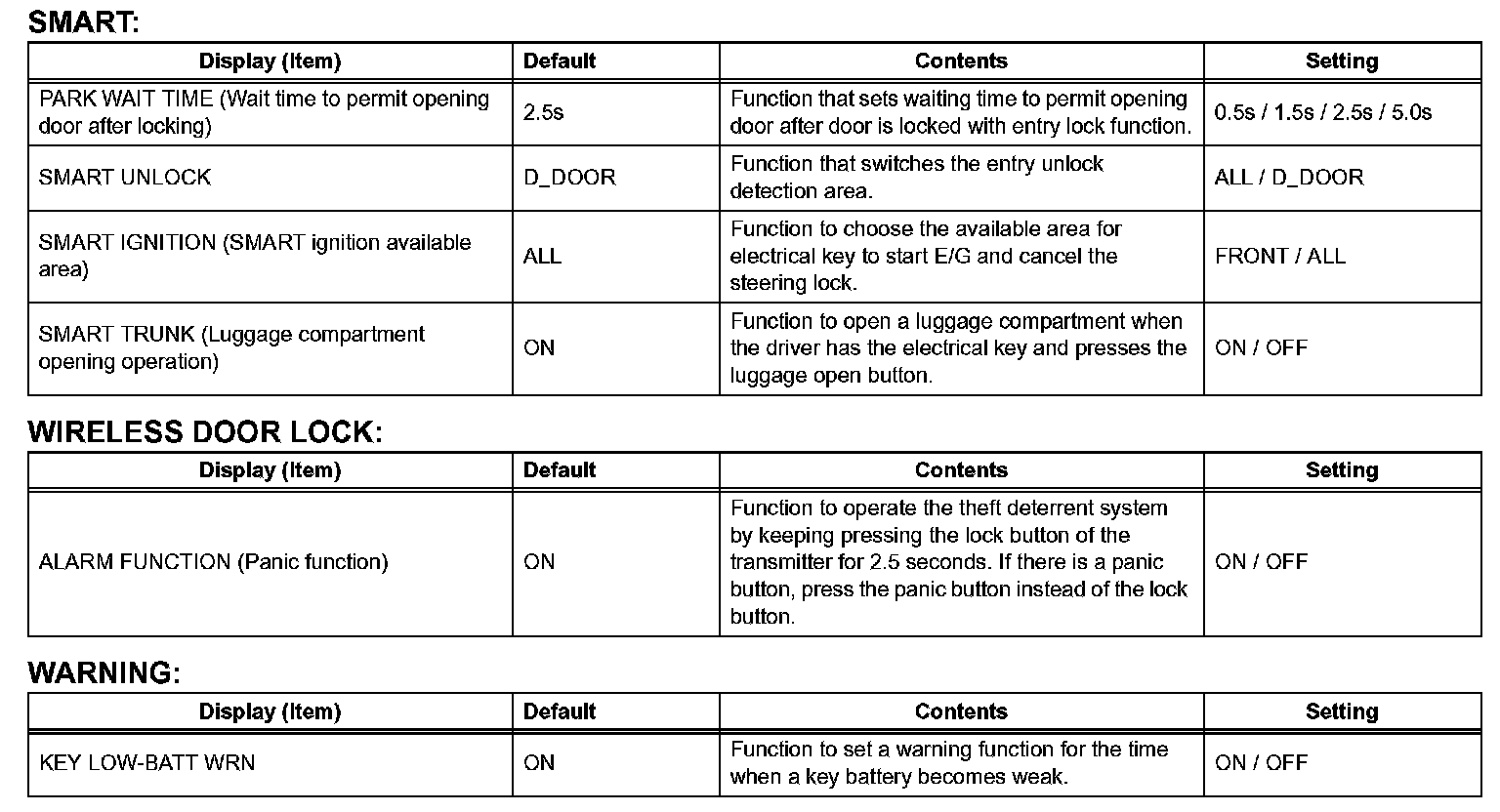 HINT: The function only changes the entry unlock mode of the smart key system. It does not switch the unlocking of the wireless door lock control.