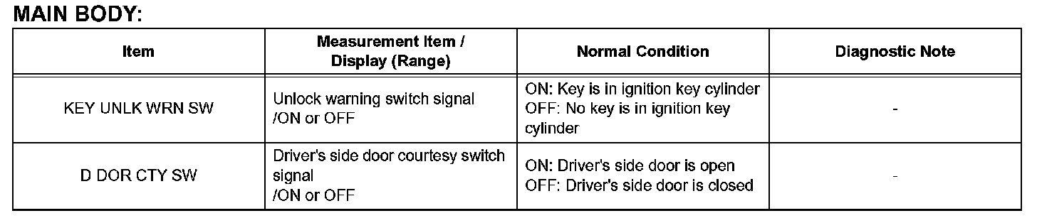 READ DATA LISTHINT: Using the intelligent tester to read the DATA LIST allows the values or states of switches, sensors, actuators and other items to be read without removing any parts. This non intrusive inspection can be very useful as intermittent conditions or signals may be discovered before parts or wiring is disturbed. Reading the DATA LIST information early in troubleshooting is one way to save diagnostic time.