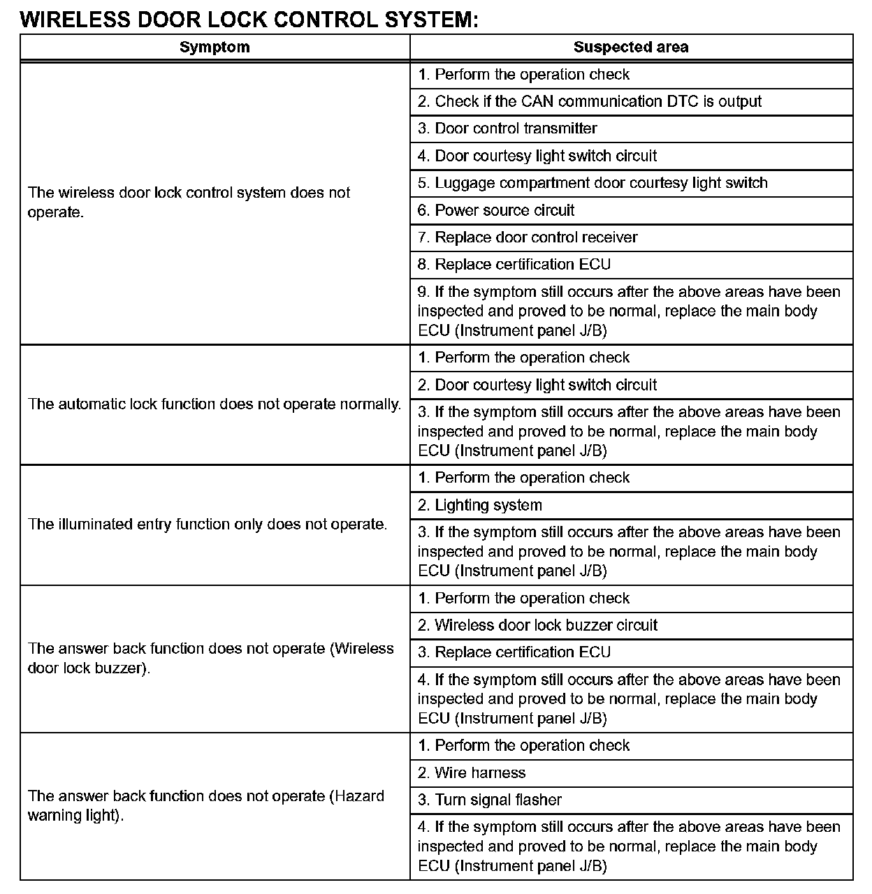 - The given is the troubleshooting procedure for the wireless door lock control of a vehicle without the smart key system.