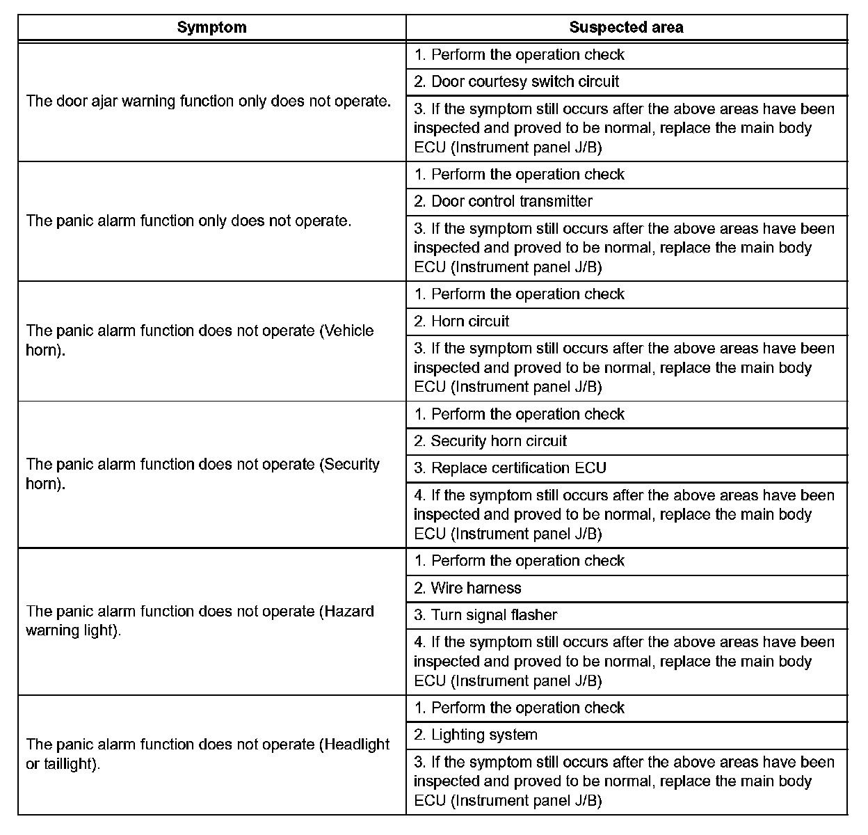 - Inspect the fuse and relay before investigating the suspected areas shown in the table.