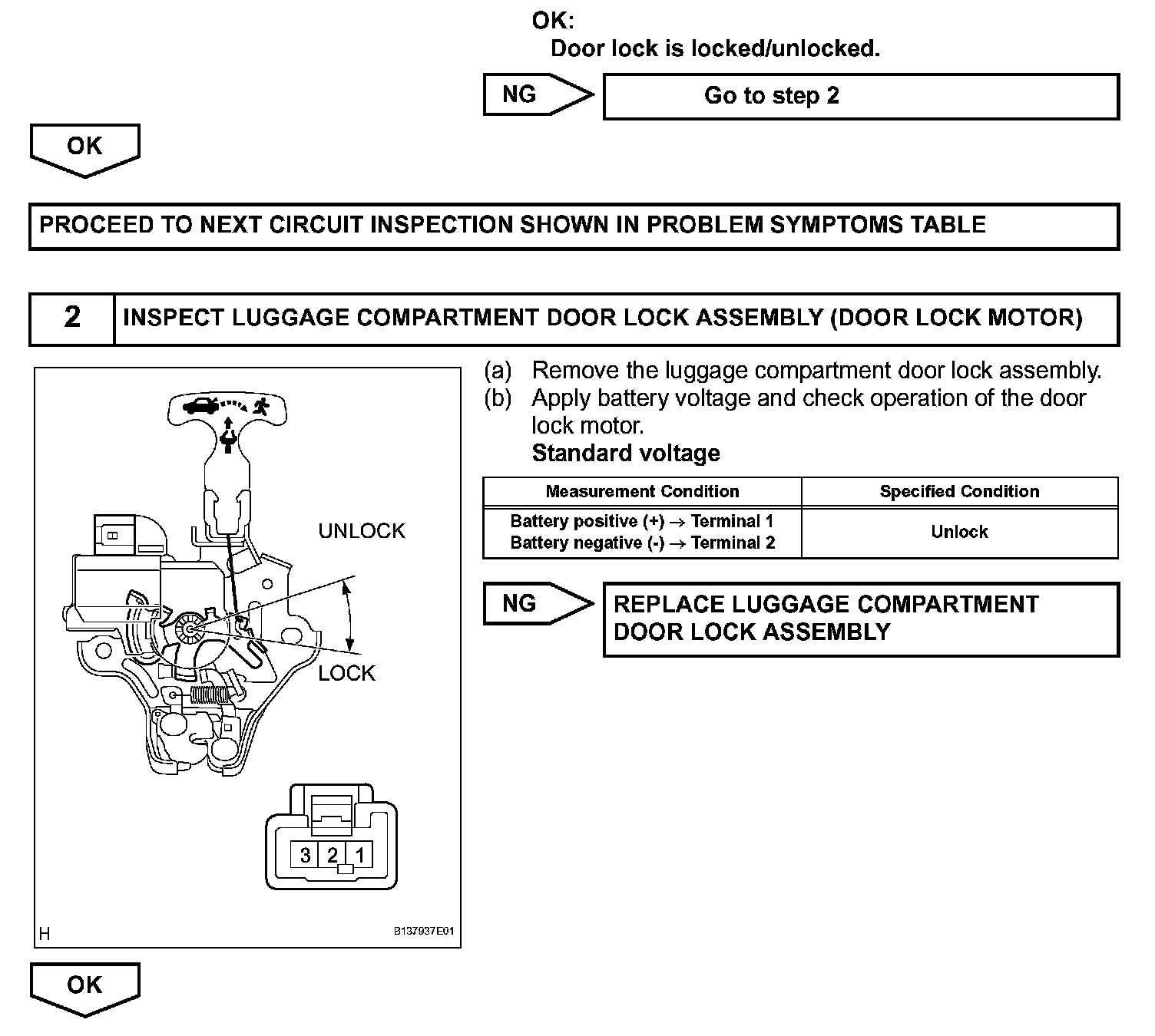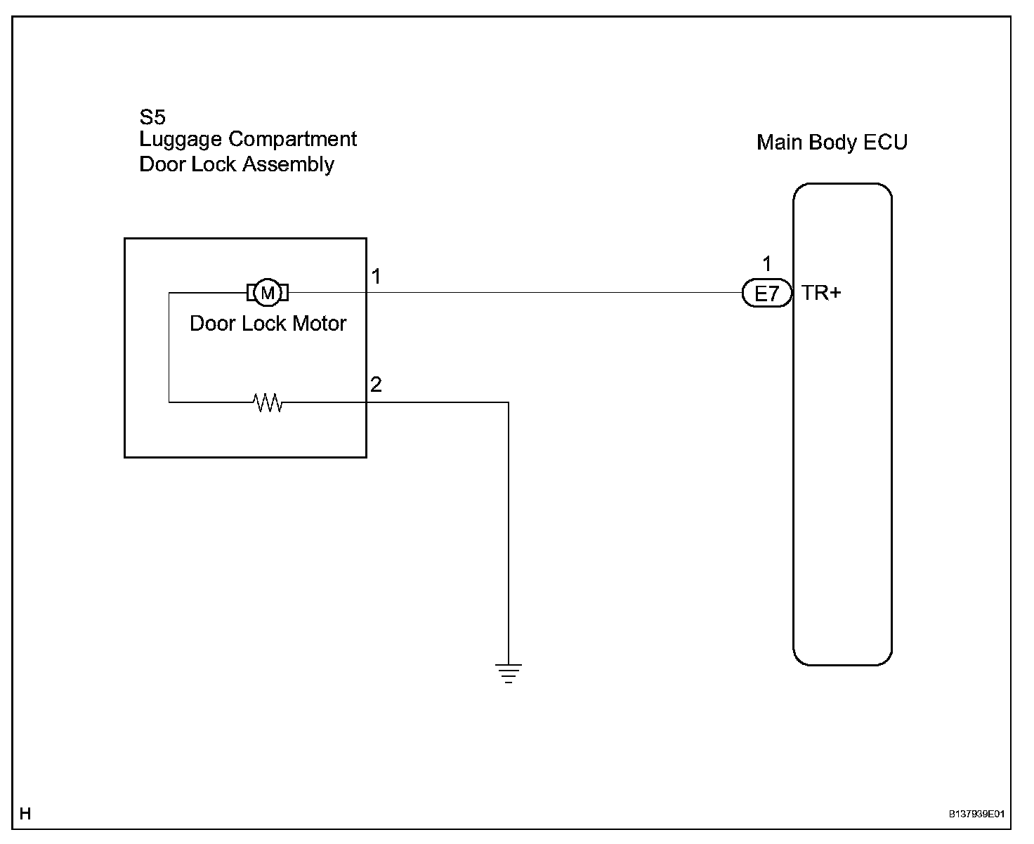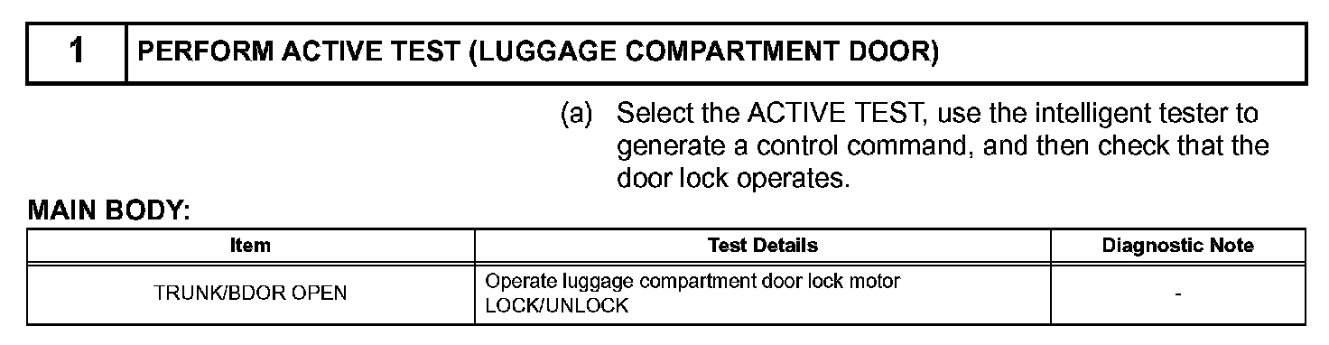 The luggage compartment door lock motor is built into the luggage compartment door lock assembly. The main body ECU receives a luggage compartment door unlock signal from the luggage compartment door lock cylinder or electrical key switch (w/ smart key system) and operates the door lock motor.