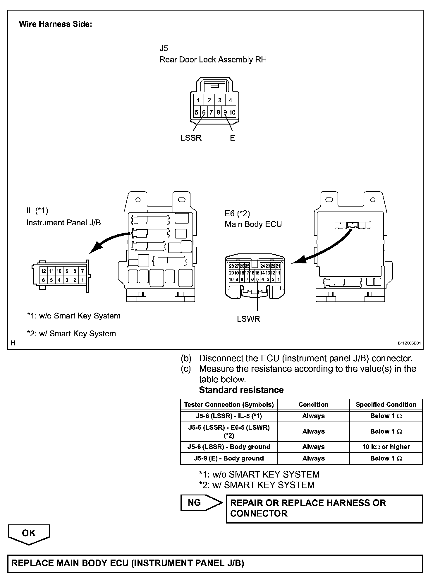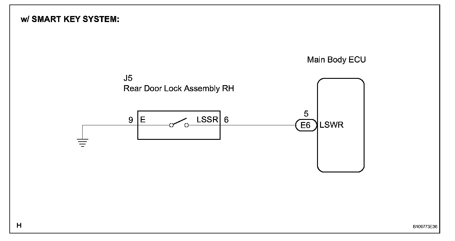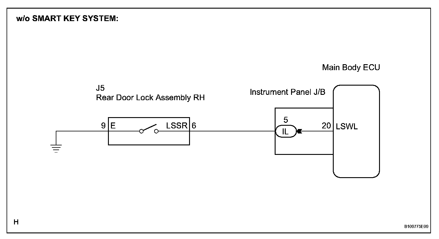 The main body ECU is connected to the rear right door lock assembly via terminal LSWR (w/ smart key system), LSWL (w/o smart key system), and rear right door lock/unlock state signals are input to the ECU. The main body ECU applies voltage to the door unlock detection switch via terminal LSWR (w/ smart key system), LSWL (w/o smart key system). When the door unlock detection switch is on (there is continuity between the switch terminals), a lock state signal is input to the ECU. When the switch is off (there is no continuity between the switch terminals), an unlock state signal is input.