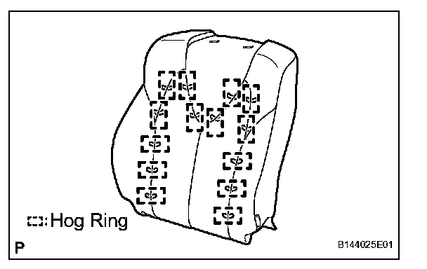 a. Using hog ring pliers, install the front separate type seat back cover to the front seat back pad with 14 new hog rings.