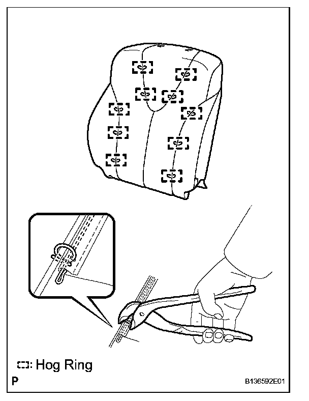 a. Using hog ring pliers, install the front separate type seat back cover to the front seat back pad with 10 new hog rings.