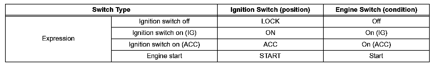 a. The type of ignition switch used on this model differs according to the specifications of the vehicle. The expressions listed in the table below are used.