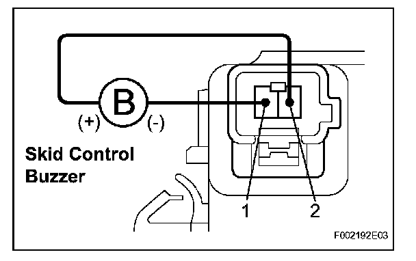Apply battery negative voltage to terminal 1, and battery positive voltage to terminal 2 of the skid control buzzer, and then check that the buzzer sounds.