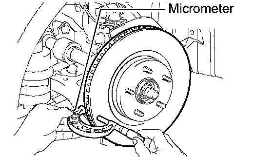 (c) If the runout exceeds the maximum value, change the installation positions of the disc and axle so that the runout will become minimal. If the runout exceeds the maximum even after the installation positions are changed, check the bearing play in the axial direction and the axle hub runout. If the bearing play and the axle hub runout are normal and if the disc thickness is not within the specified range, grind the disc. If the disc thickness is less than the minimum, replace the disc.